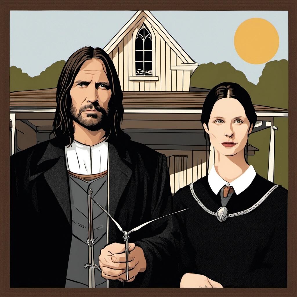 Prompt: Arwen and Aragorn as American Gothic