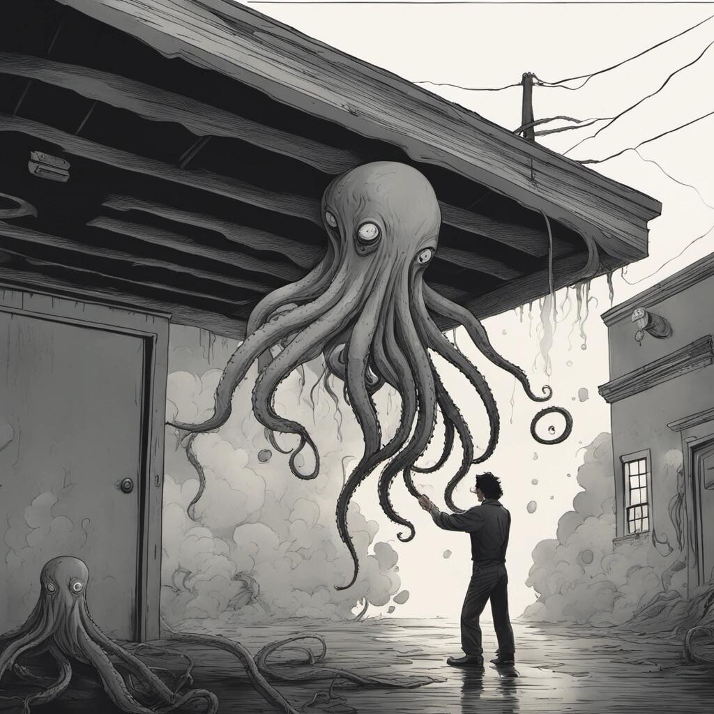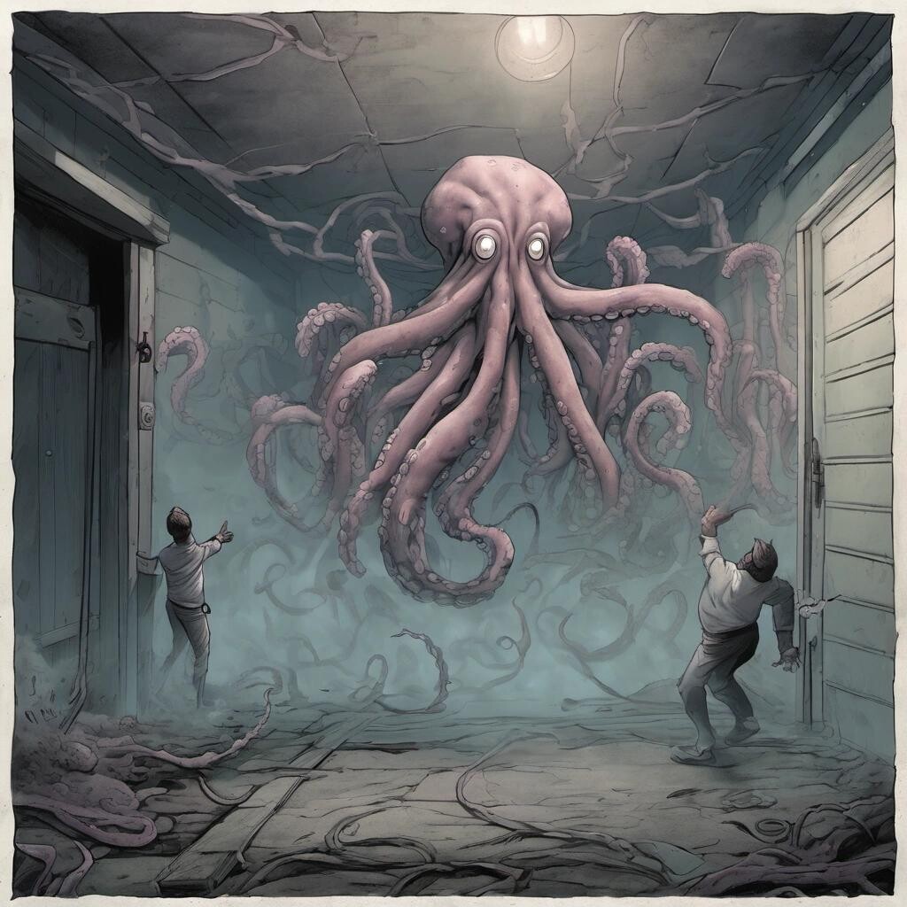 Prompt: in a dense cloud of mist, disembodied tentacles emerge from underneath a cracked garage door and search the ground for a small group of people in the corner. One tentacle grabs one man's leg and he is lifted into the air
