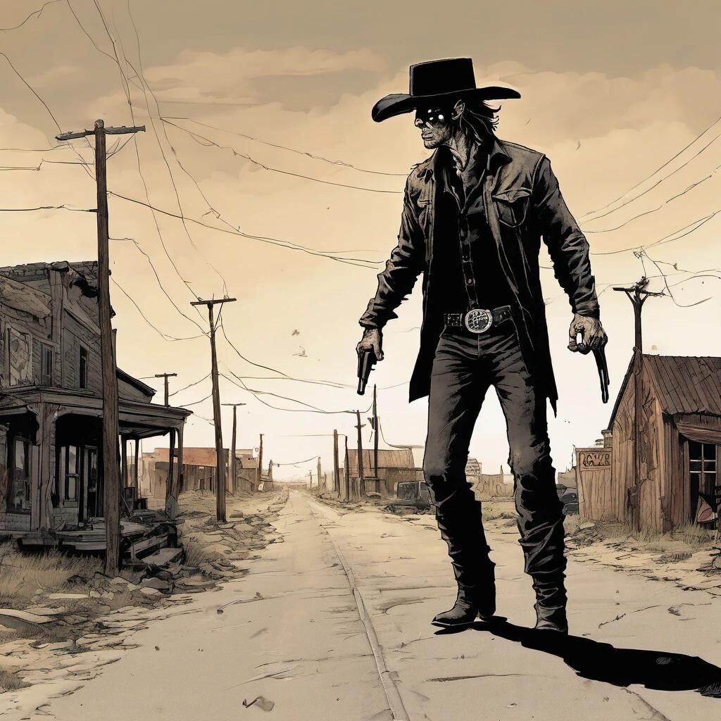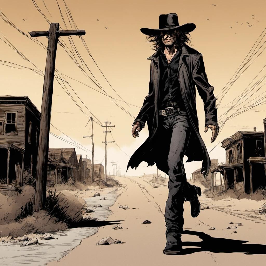 Prompt: Randall Flagg, the walking man, skipping down a post apocalyptic small town road. He wears a black cowboy hat, black pants, and black boots