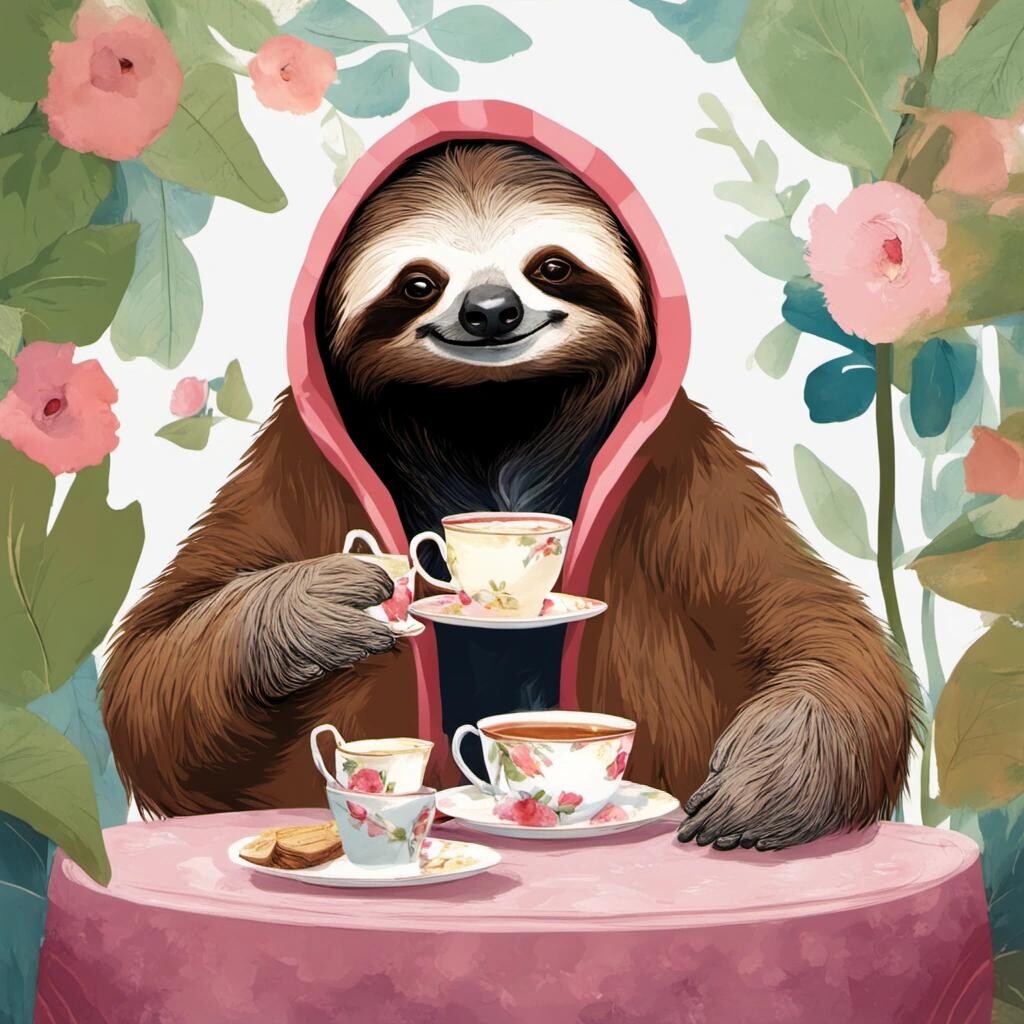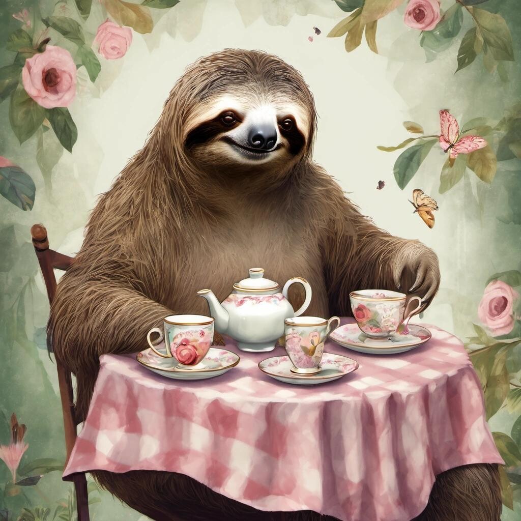 Prompt: an eccentric sloth having a tea party
