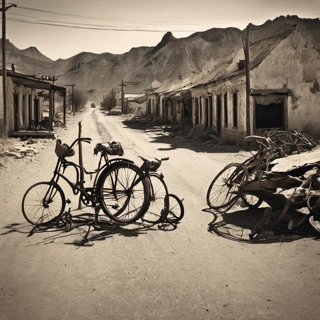 Prompt: the town Desperation. An old, deserted mining town. Bikes lay fallen in the road with scorpions crawling across the handle bars.