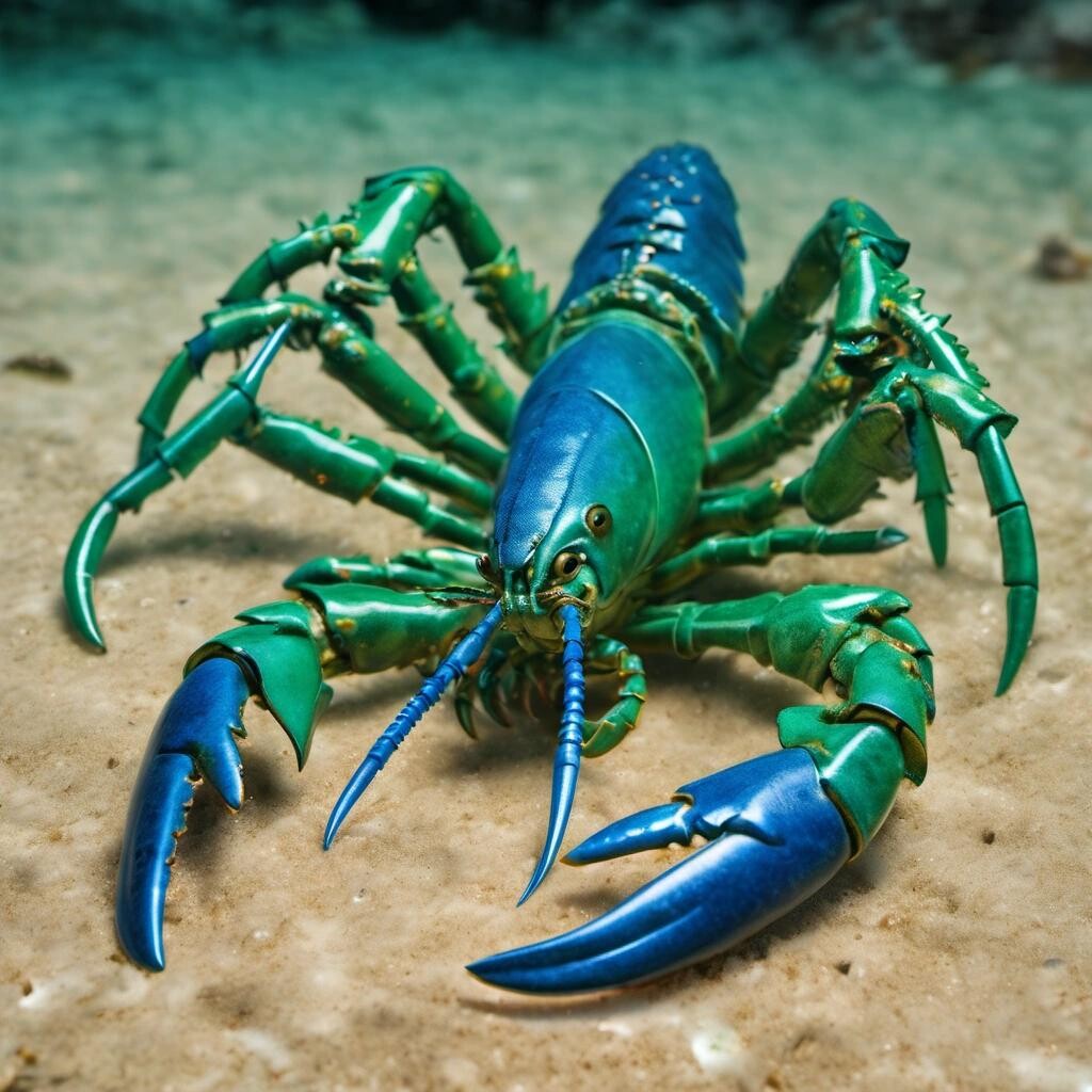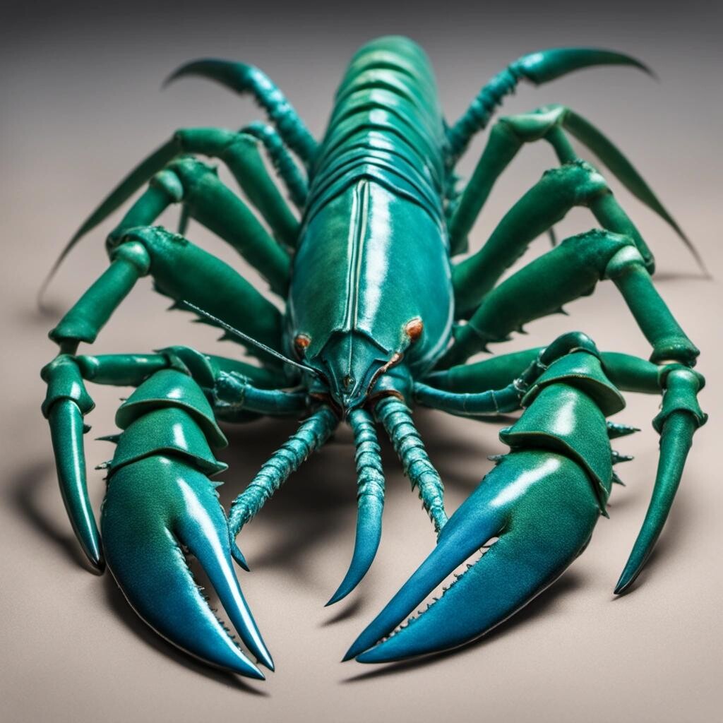 Prompt: the lobstrosities. Mutant blue-green lobsters with three sets of claws and sharp teeth emerging from their small, foaming mouths