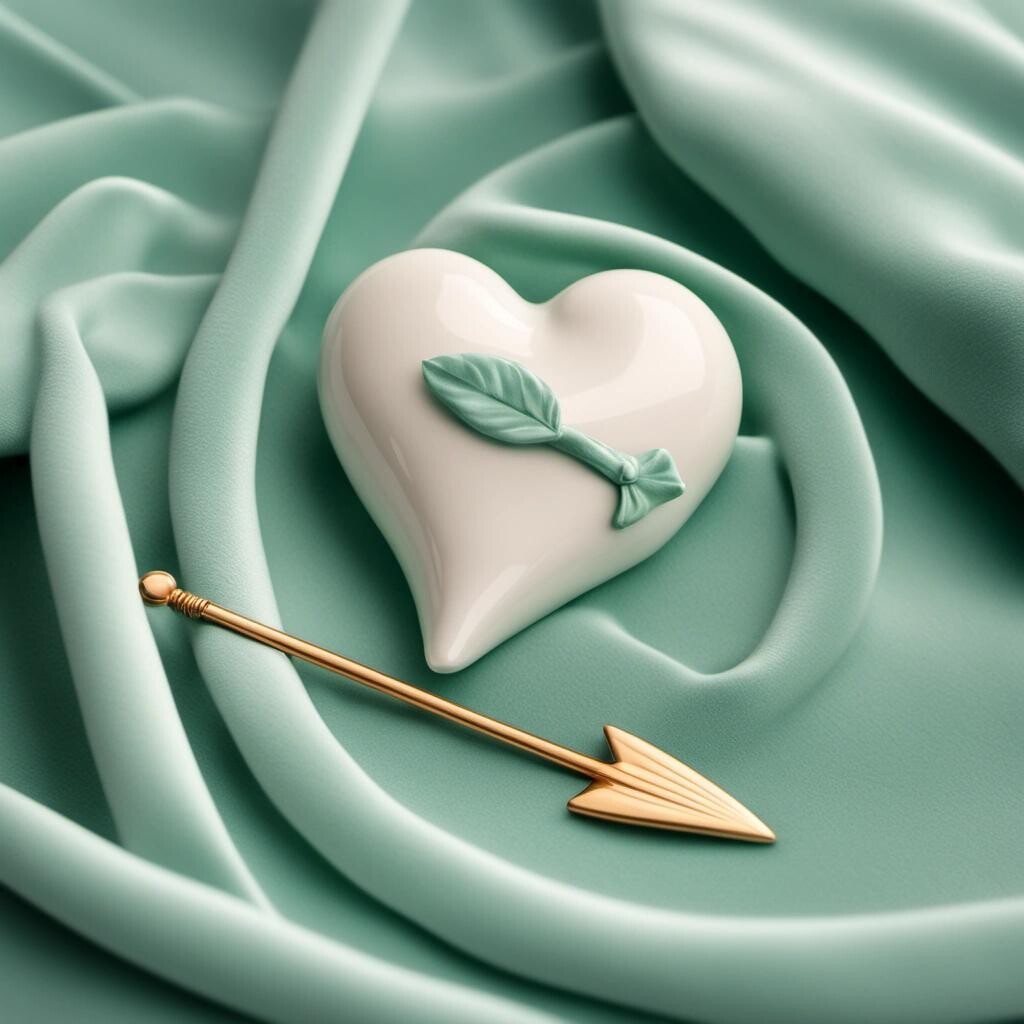 nostr:npub1p5qe4mtwxascahtp6szght2nlp06gwwwwllq7e7g6308p4y9dvys8nw2sf draw for me a ceramic heart decorated like fine china with an arrow through it, lying on a mint green velvet blanket