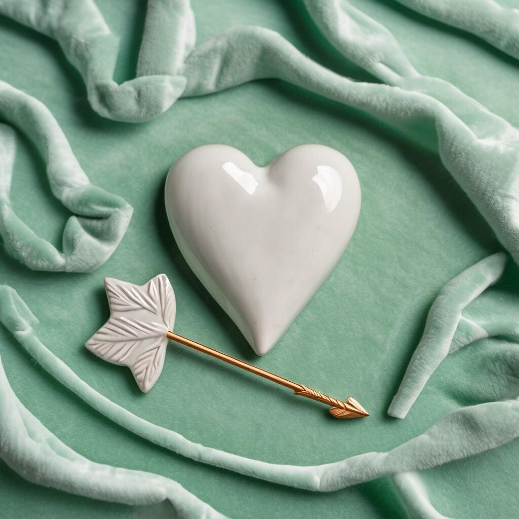 Prompt: a ceramic heart decorated like fine china with an arrow through it, lying on a mint green velvet blanket