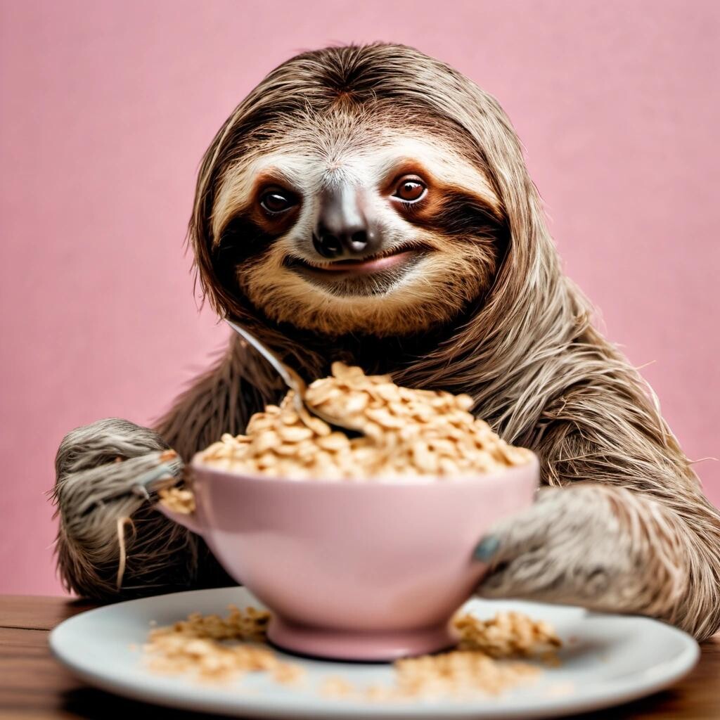 Prompt: a slothful sloth, dressed like a beauty influencer eating oatmeal in the morning