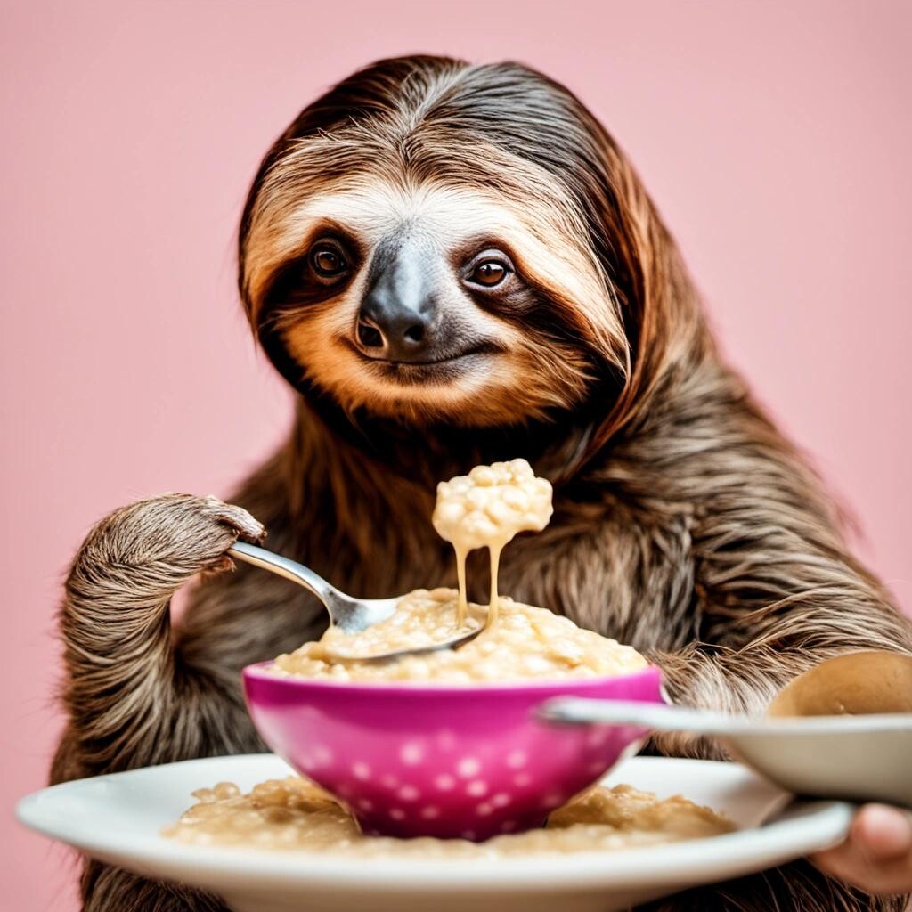 nostr:npub1p5qe4mtwxascahtp6szght2nlp06gwwwwllq7e7g6308p4y9dvys8nw2sf draw for me a slothful sloth, dressed like a beauty influencer eating oatmeal in the morning