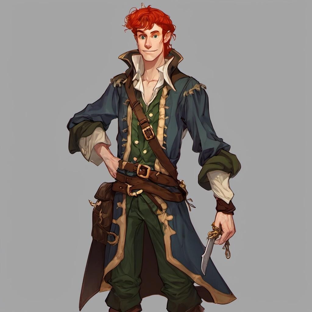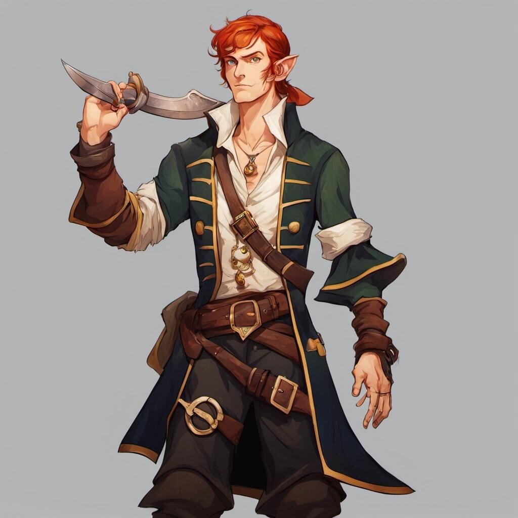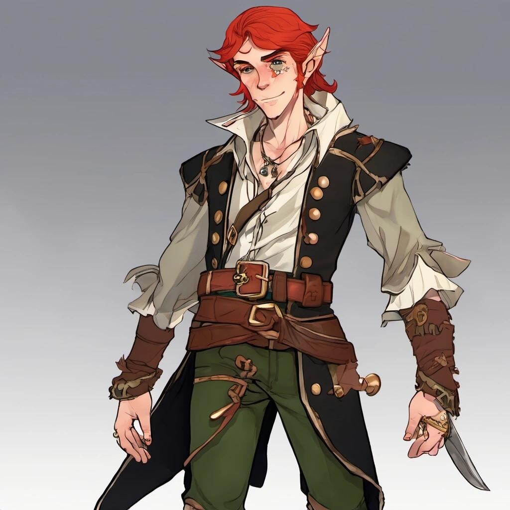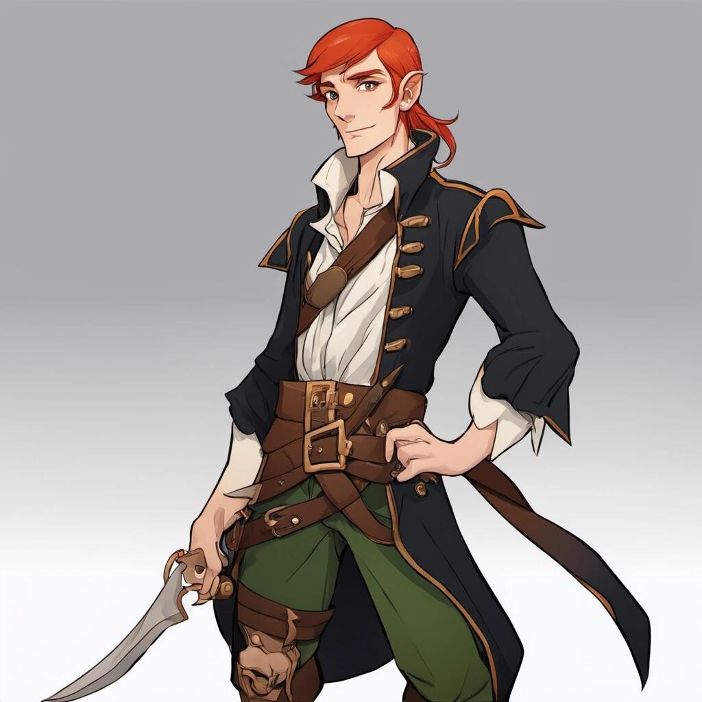 Prompt: a tall male elf with short red hair, dressed as a pirate
