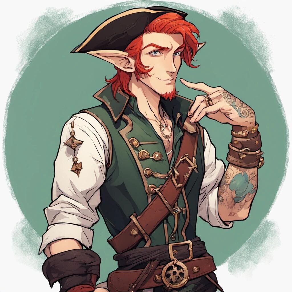 nostr:npub1p5qe4mtwxascahtp6szght2nlp06gwwwwllq7e7g6308p4y9dvys8nw2sf draw for me a tall male elf with deep red hair, dressed as a pirate