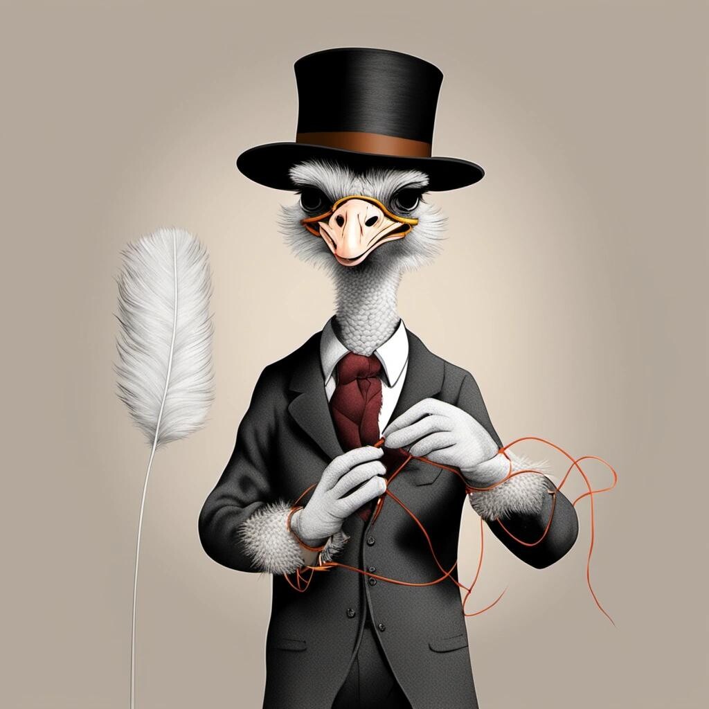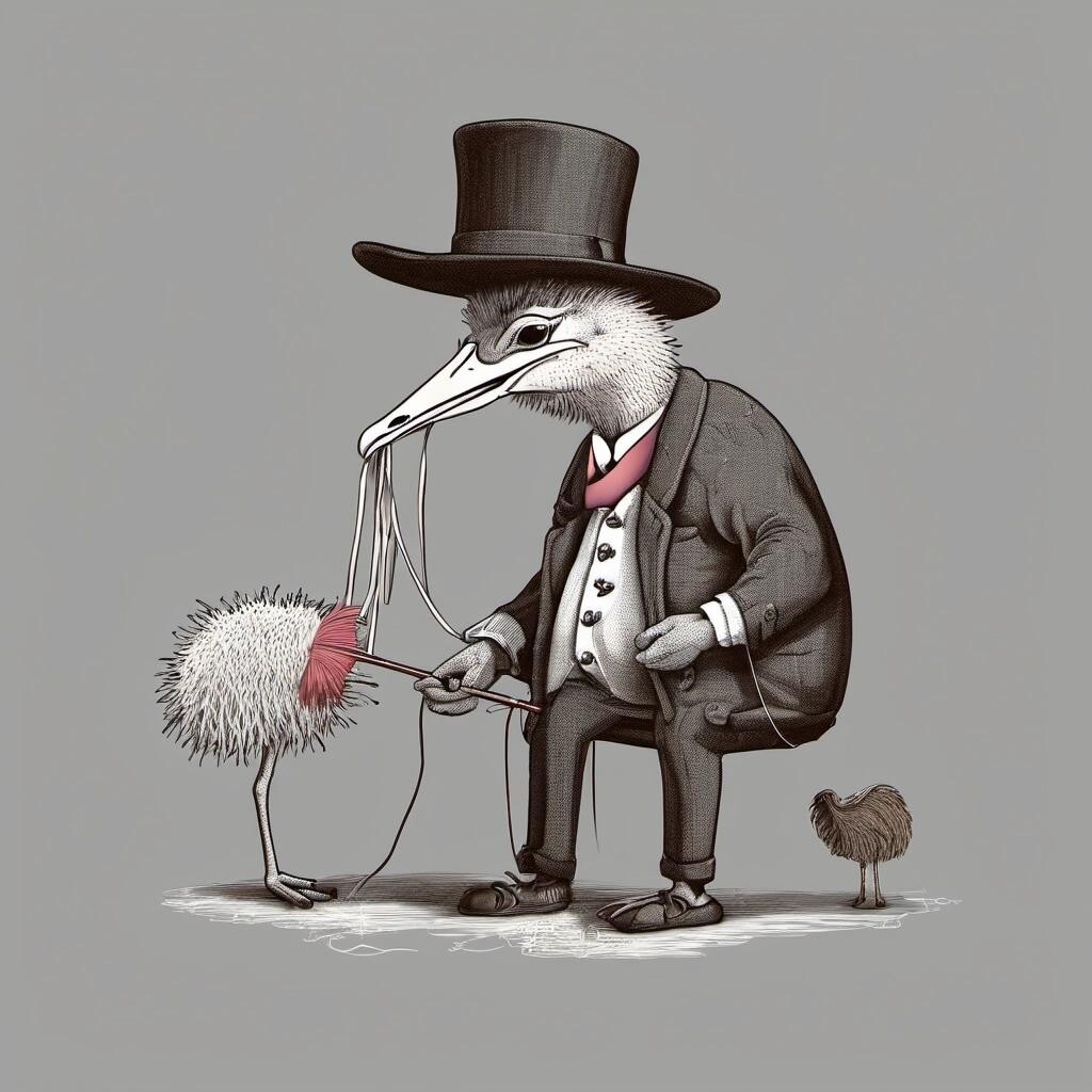 nostr:npub1p5qe4mtwxascahtp6szght2nlp06gwwwwllq7e7g6308p4y9dvys8nw2sf draw for me a gentleman ostrich knitting a sweater from his feathers