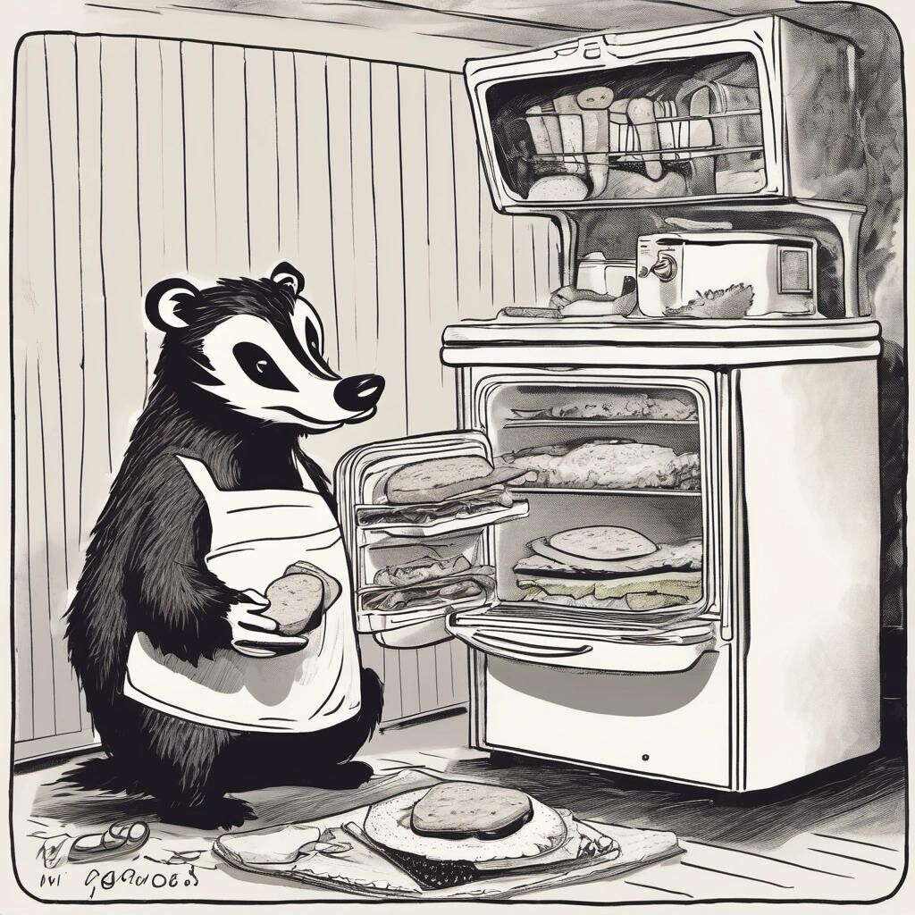 nostr:npub1p5qe4mtwxascahtp6szght2nlp06gwwwwllq7e7g6308p4y9dvys8nw2sf draw for me Mr Badger making a dagwood sandwich next to his vintage refrigerator at midnight
