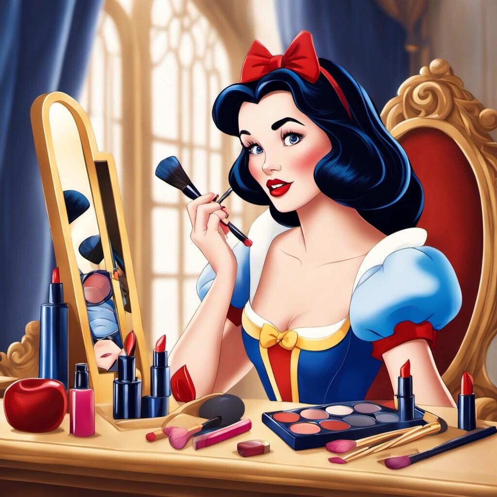 nostr:npub1p5qe4mtwxascahtp6szght2nlp06gwwwwllq7e7g6308p4y9dvys8nw2sf draw for me Disney Snow White doing her makeup as a beauty influencer