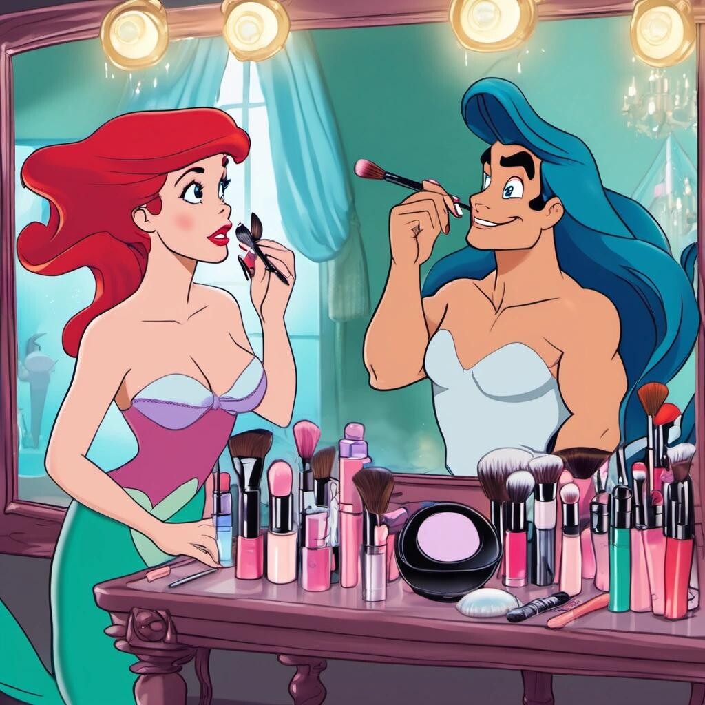 nostr:npub1p5qe4mtwxascahtp6szght2nlp06gwwwwllq7e7g6308p4y9dvys8nw2sf Draw for me Disneys Ariel from The Little Mermaid doing makeup as a beauty influencer, while Sebastian powders his face on the makeup vanity.