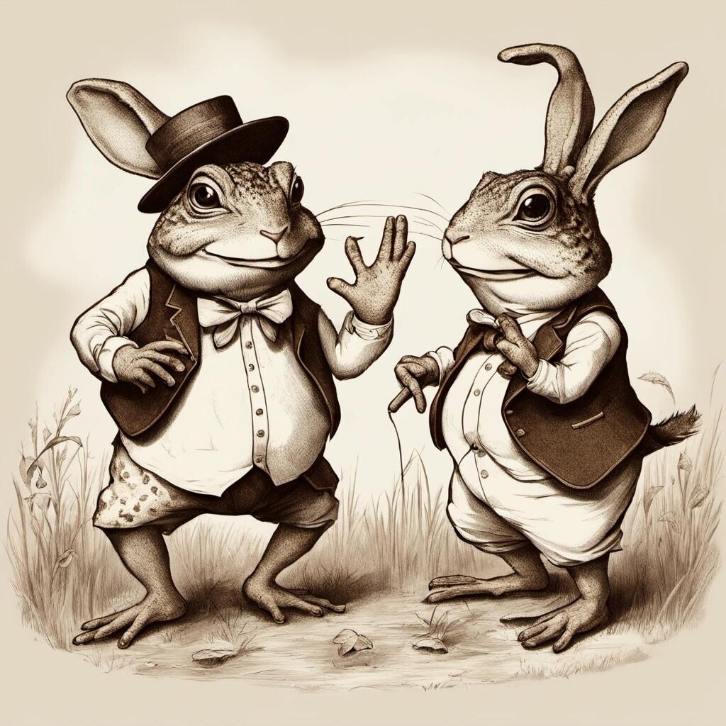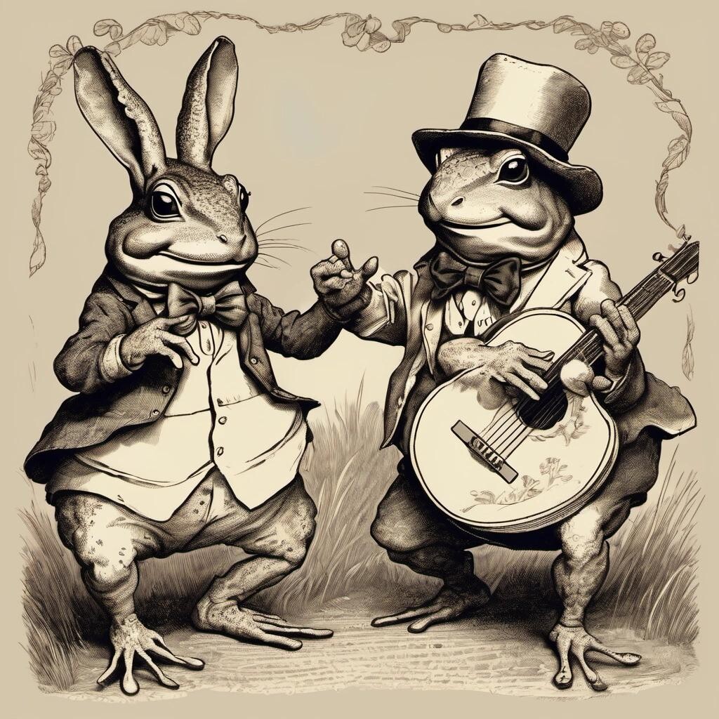 nostr:npub1p5qe4mtwxascahtp6szght2nlp06gwwwwllq7e7g6308p4y9dvys8nw2sf Draw for me a charming toad and a country rabbit doing a song and dance routine to bluegrass music