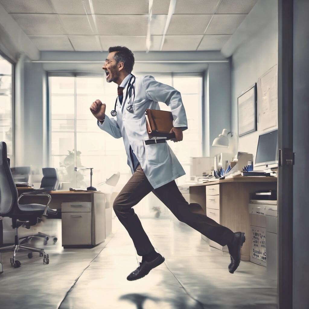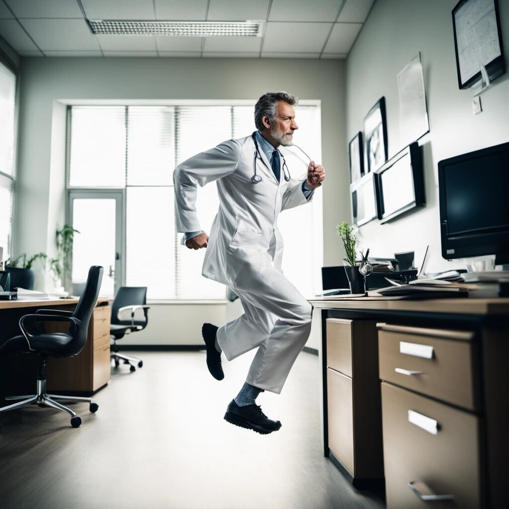 Prompt: a doctor running around an office with his shoe in his hand