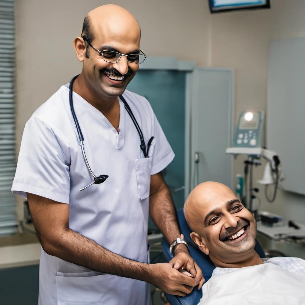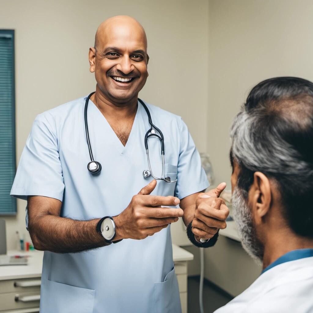 Prompt: a bald, Indian doctor smiling at his patient