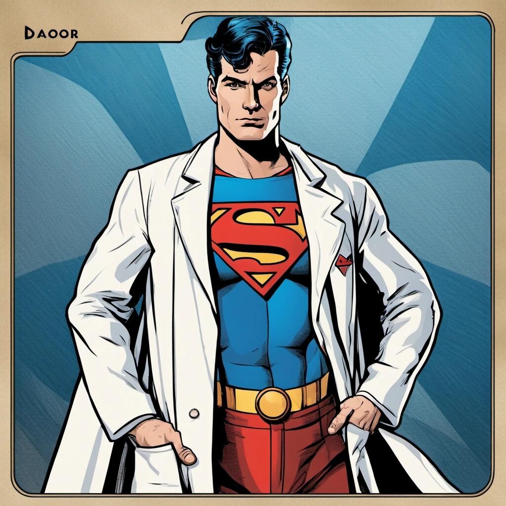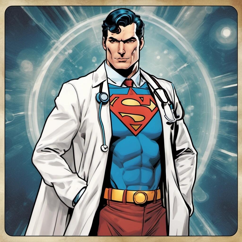 Prompt: Superman wearing a doctor’s white coat in the style of a trading card