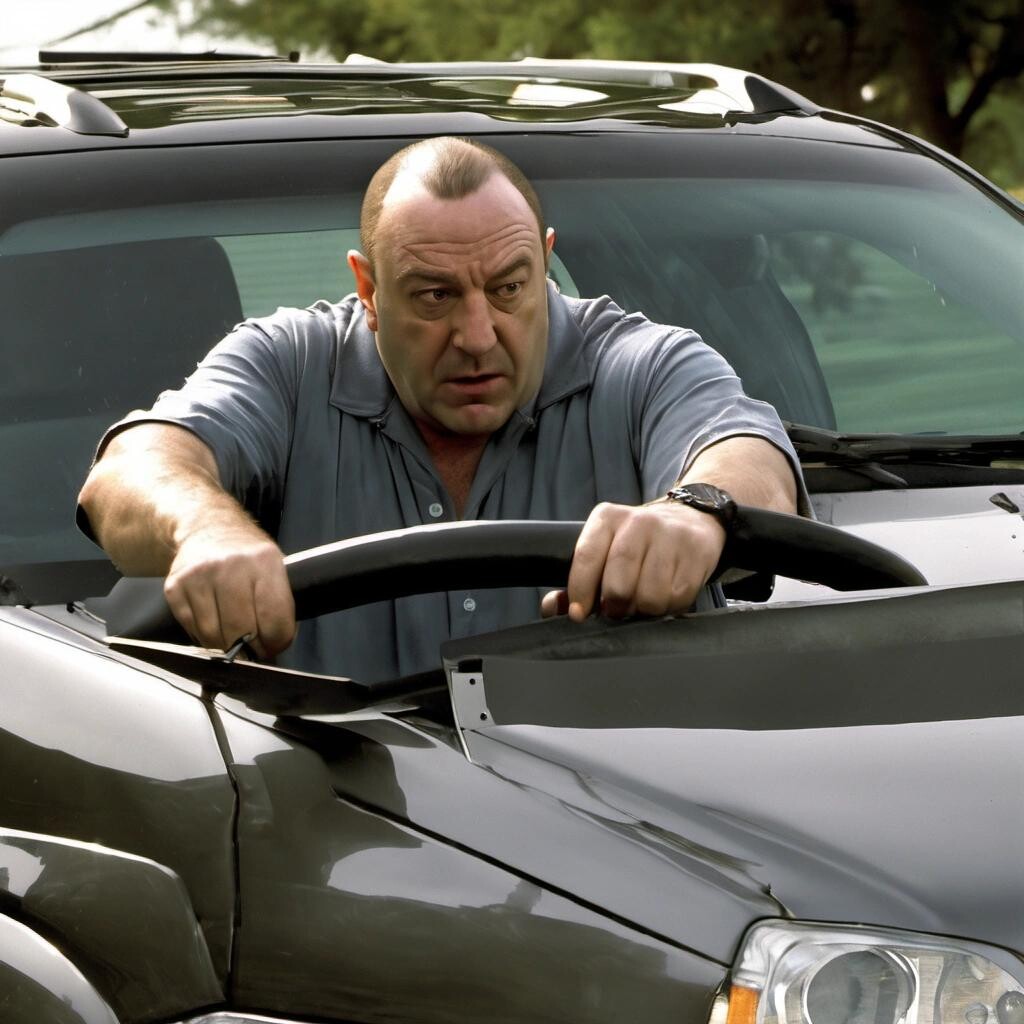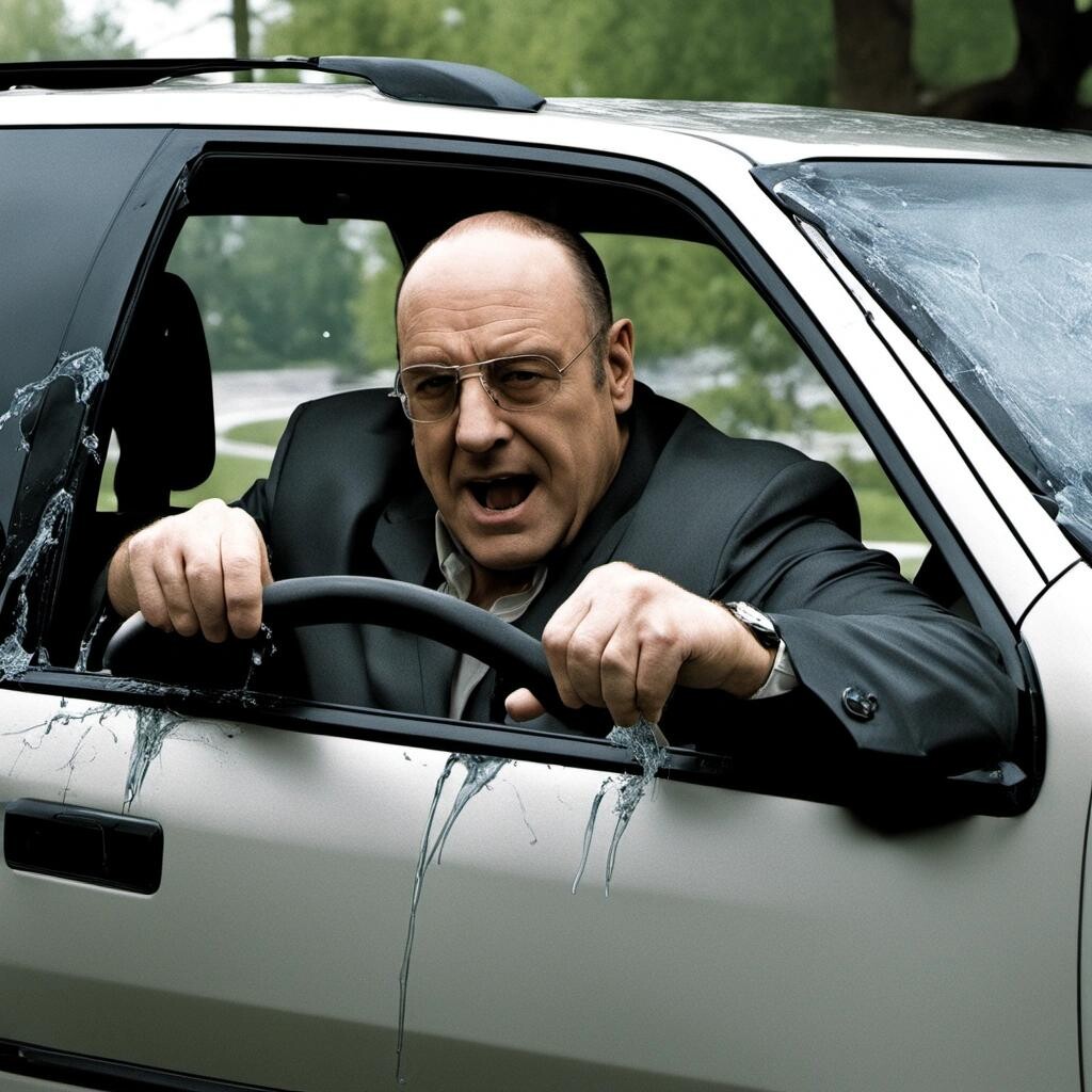 Prompt: tony soprano shattering the windshield on walter white's pontiac aztek