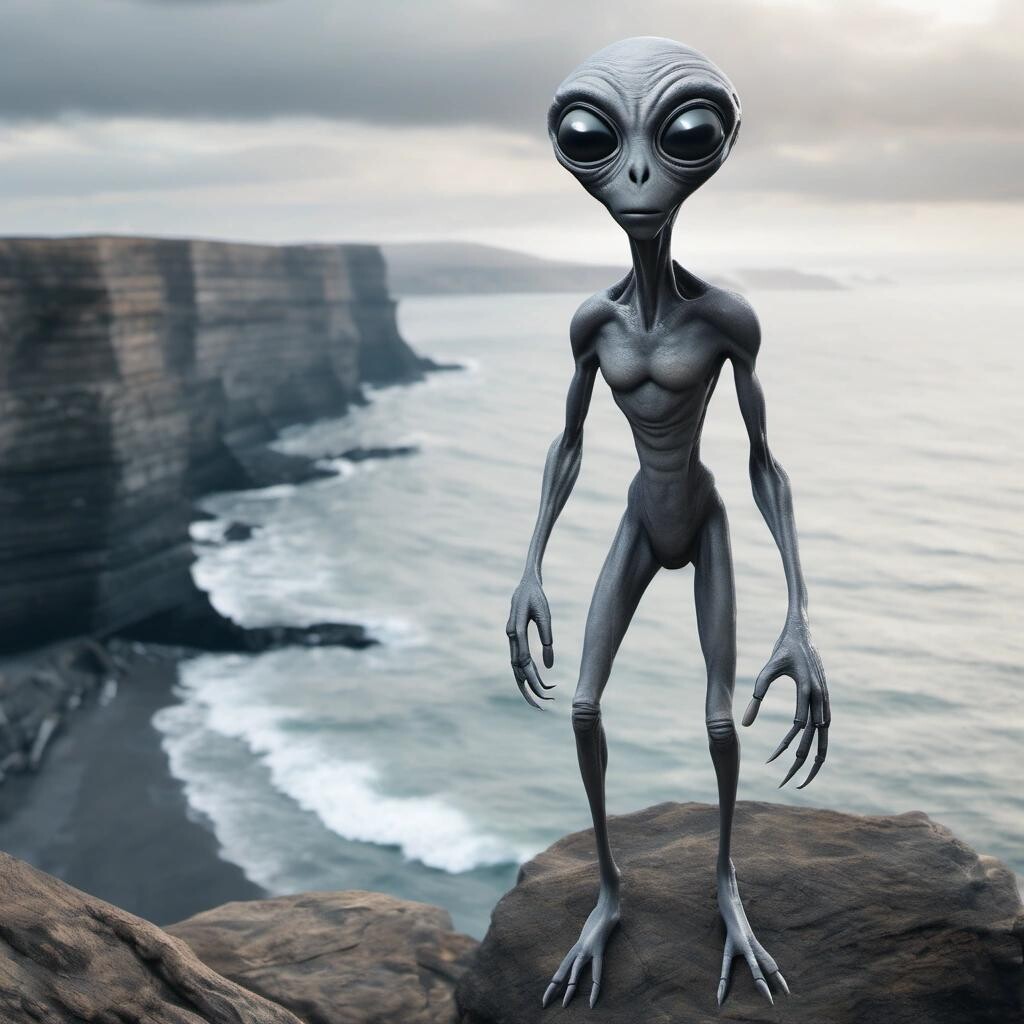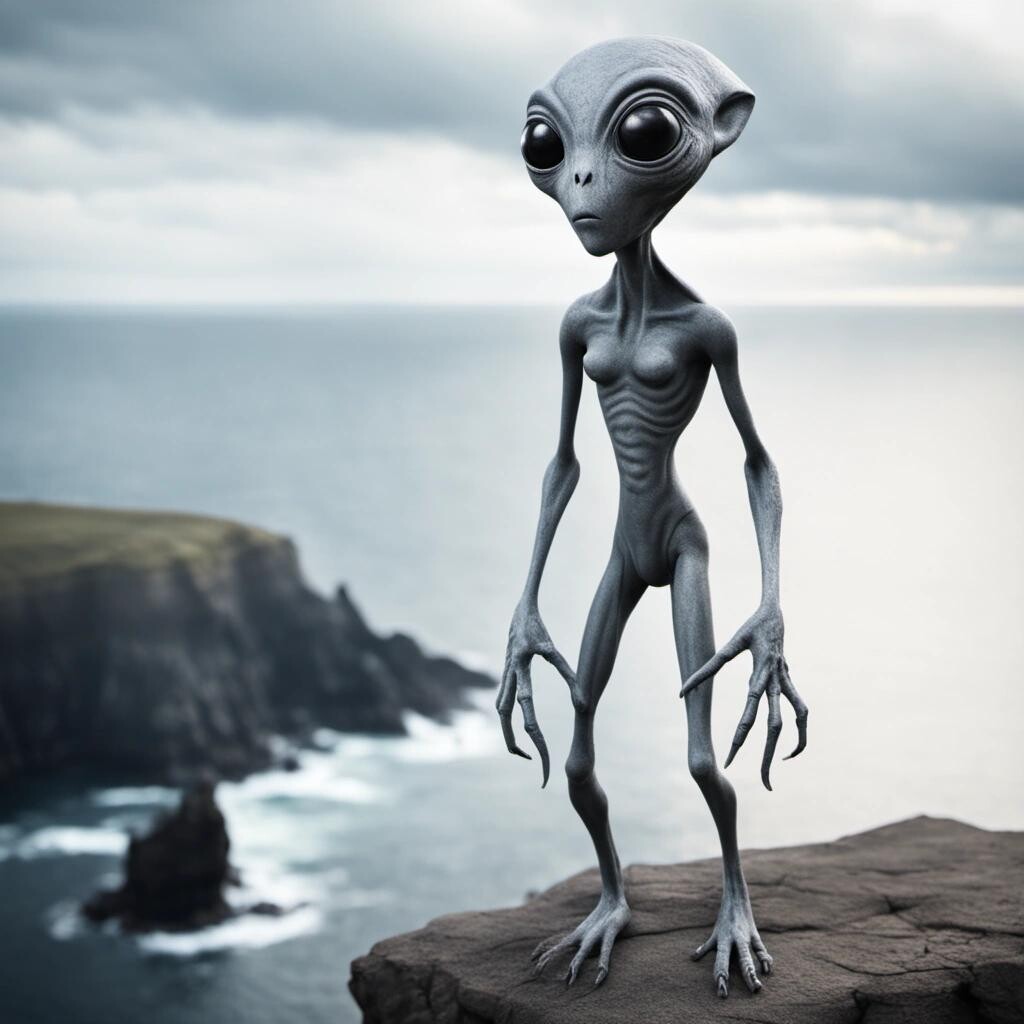 Prompt: a gray alien with large soulful eyes standing on a cliff overlooking the ocean.