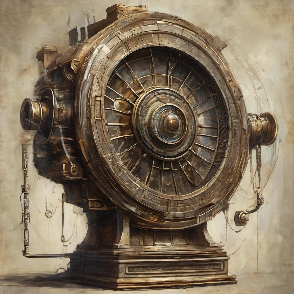 nostr:npub1p5qe4mtwxascahtp6szght2nlp06gwwwwllq7e7g6308p4y9dvys8nw2sf draw for me an ancient time machine, unknown power source, greek philosopher, realism