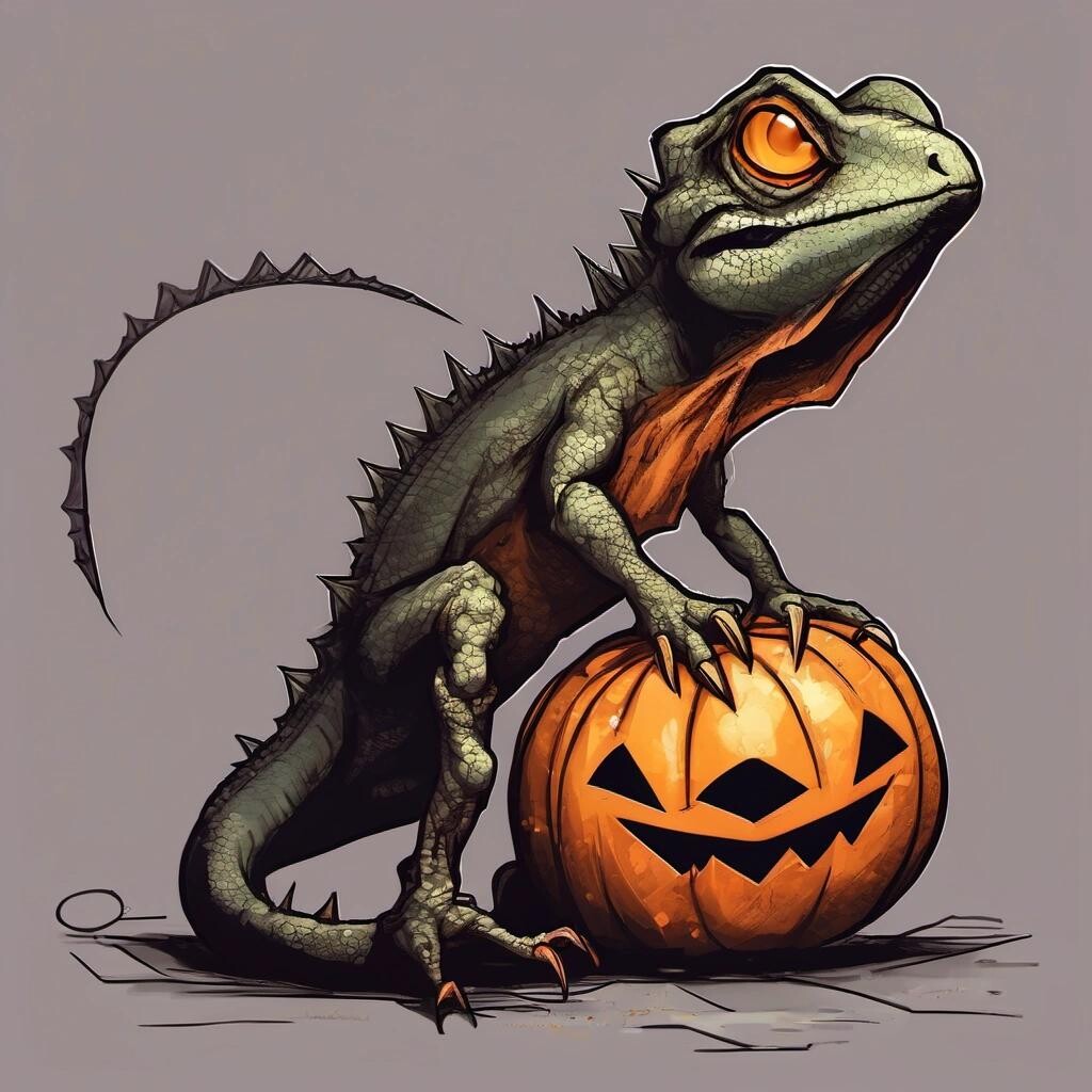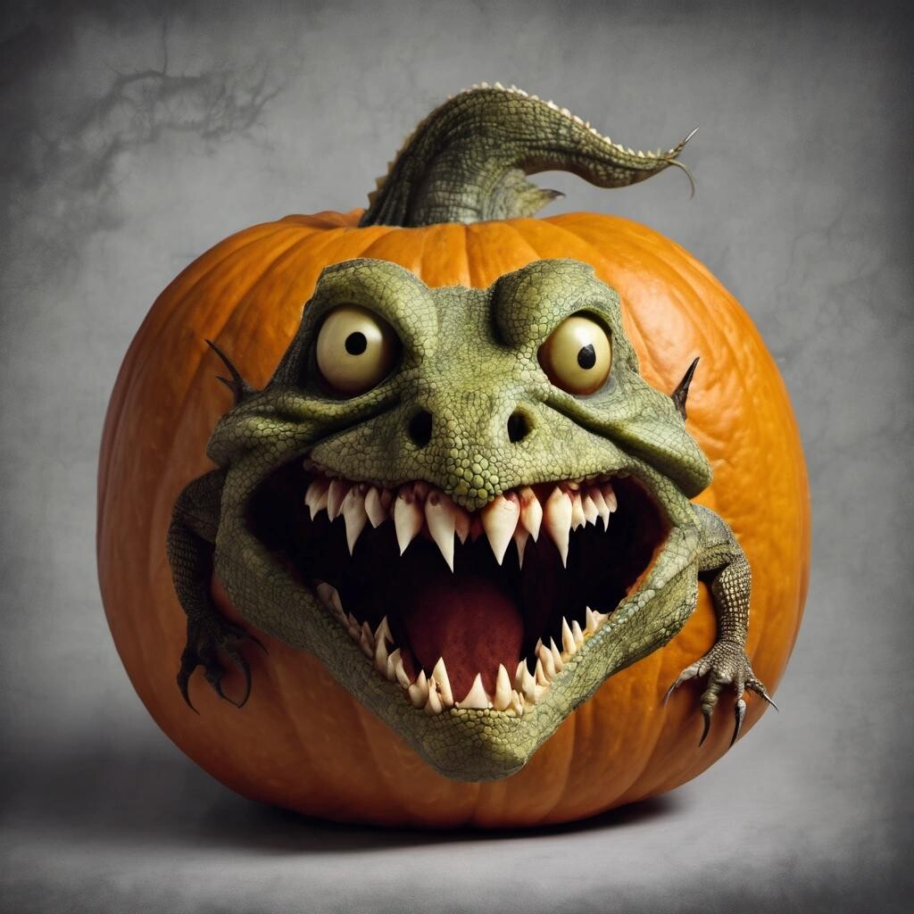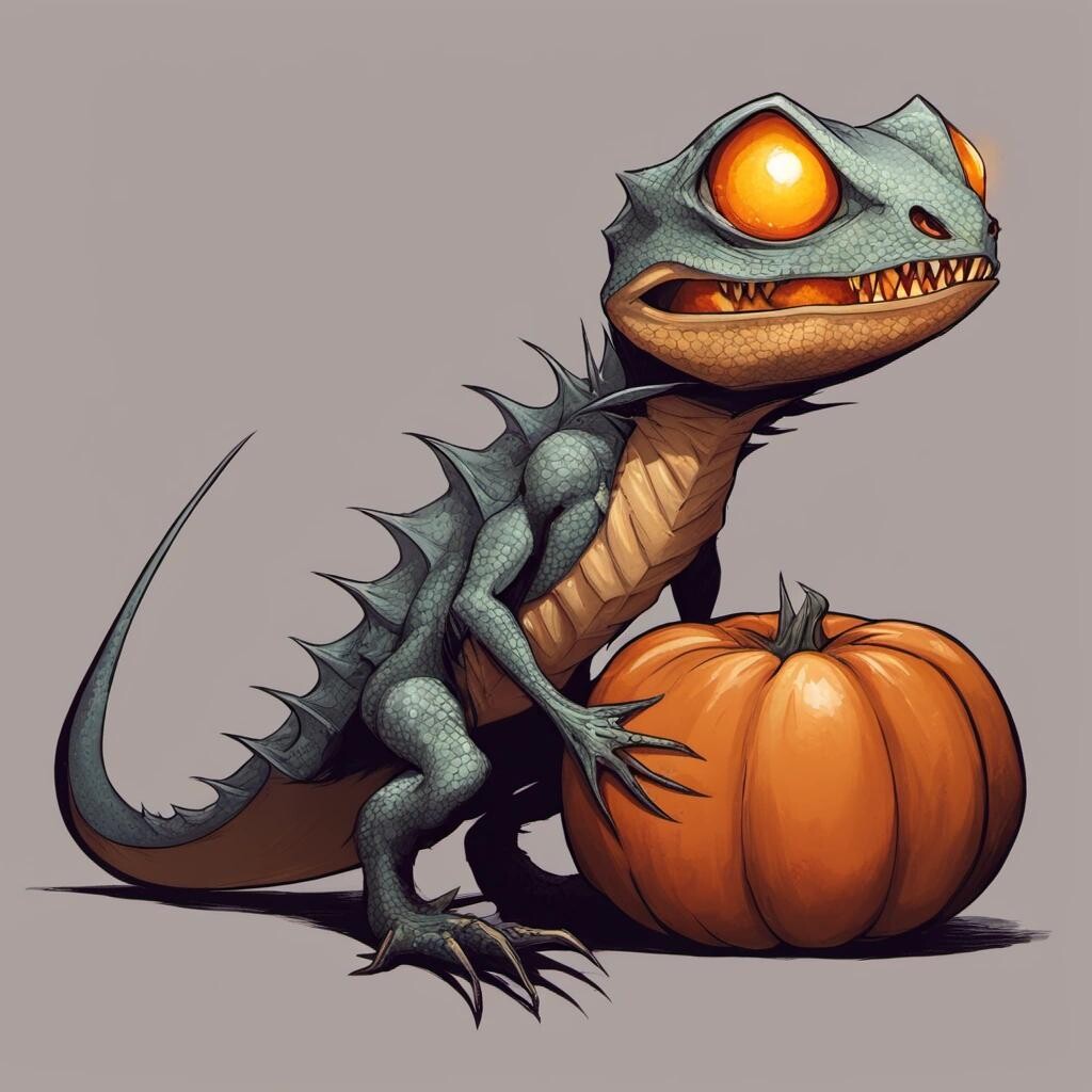 Prompt: a lizard shaped pumpkin head that is a vampire