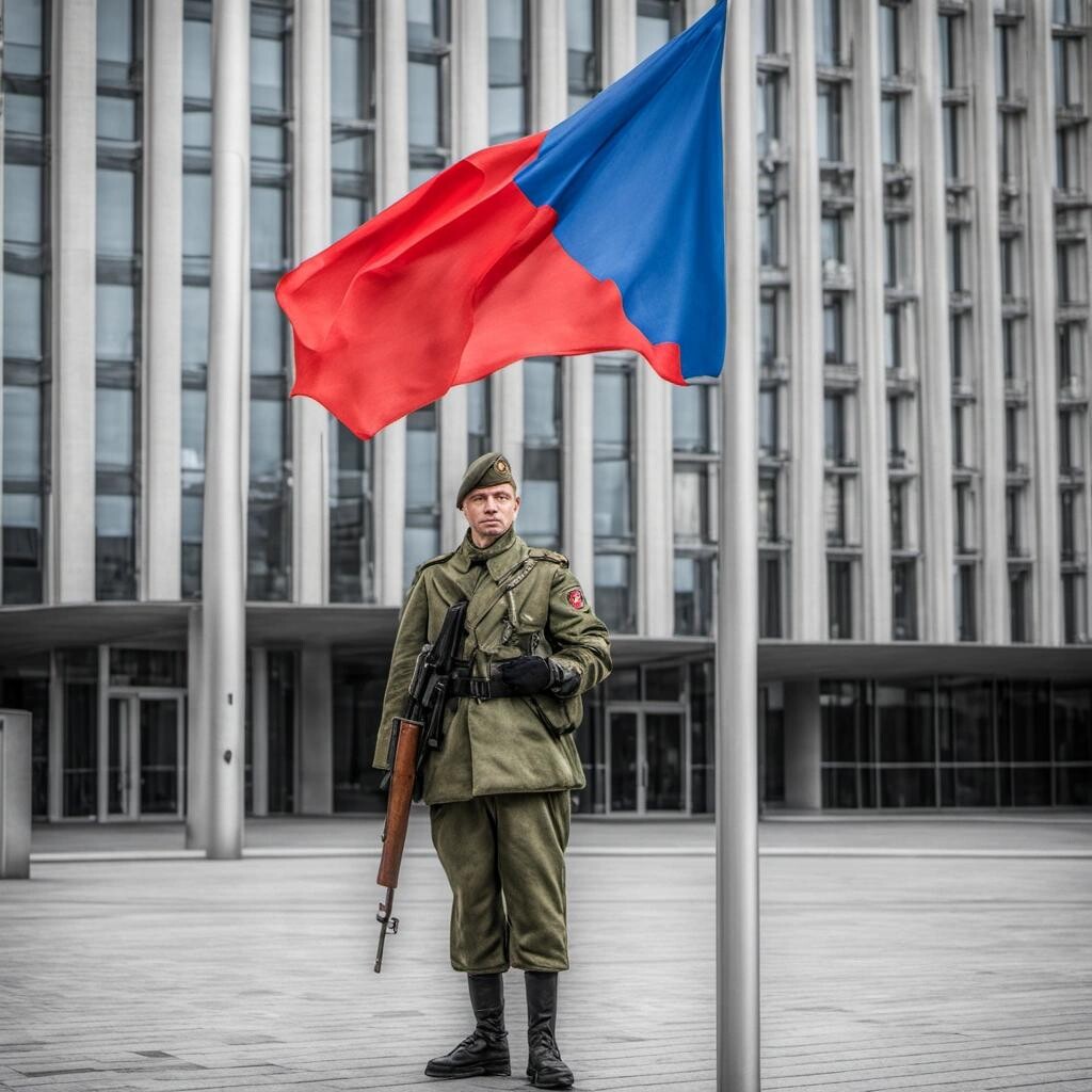 Prompt: a modern Russian soldier who put the sovietic flag on the UE building in Brussels.