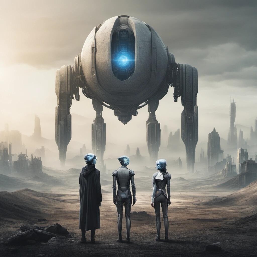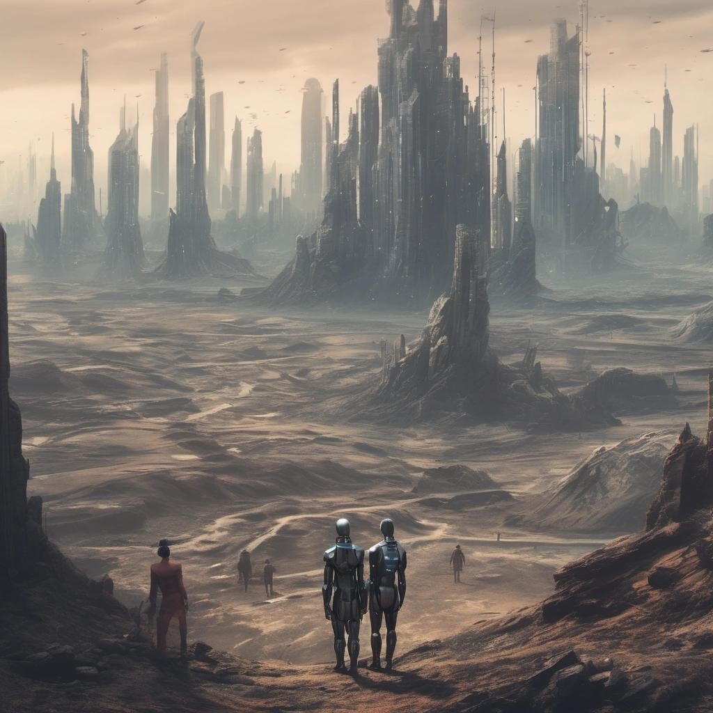 Prompt: human looking androids in a dystopian landscape