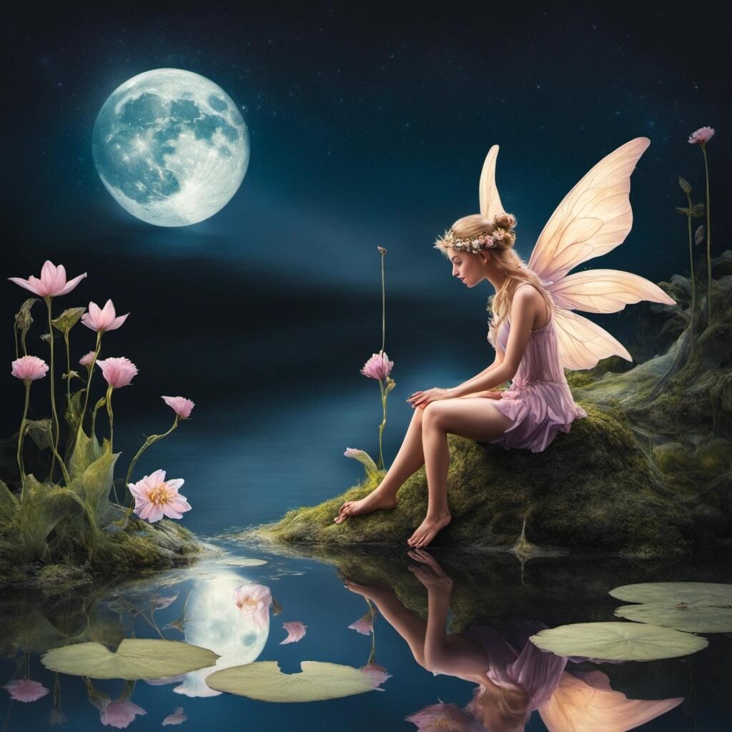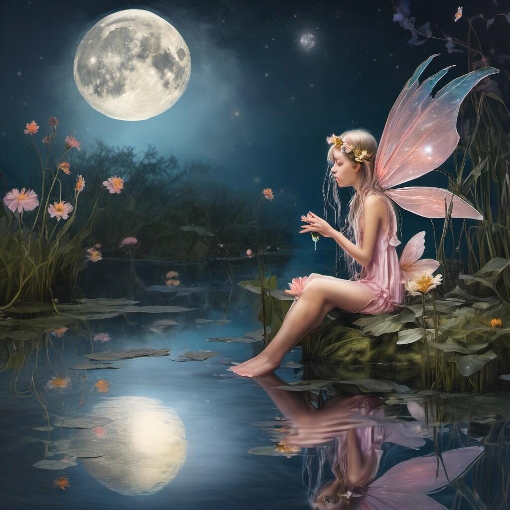 Prompt: a fairy sitting on a flower looking down on the reflection of the moon in a pond below