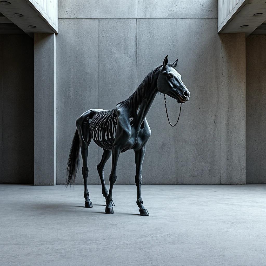 Prompt: a photograph of a zombie horse in a gray empty concrete room