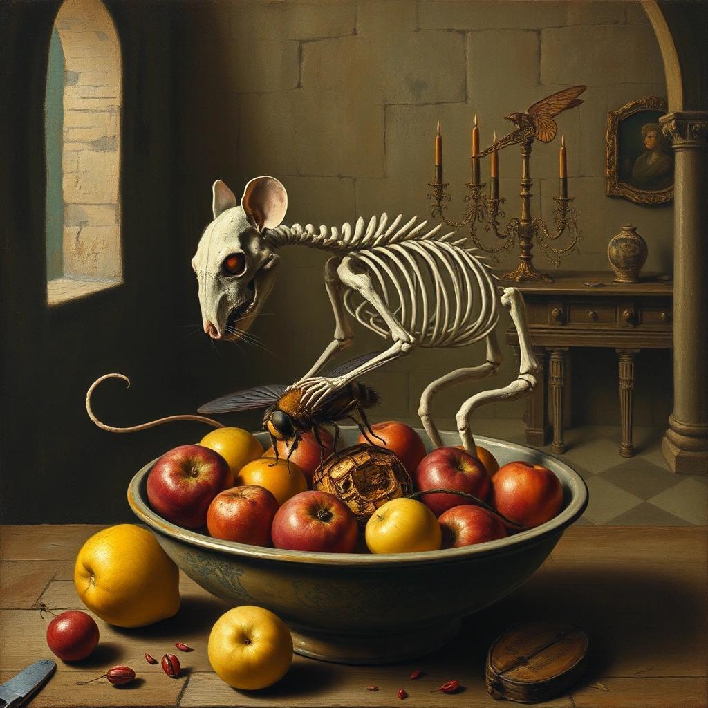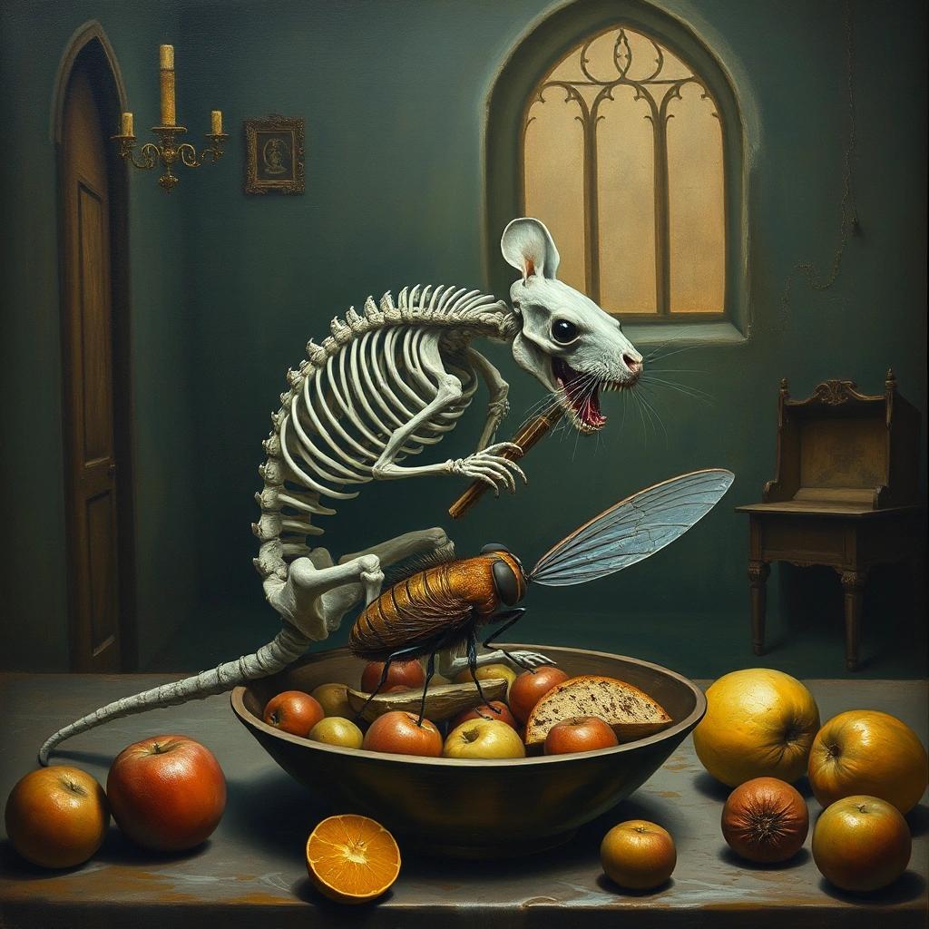 Prompt: a surrealist painting of the skeleton of a rat eating on a big fly in a bowl of rotten fruit in a castle room