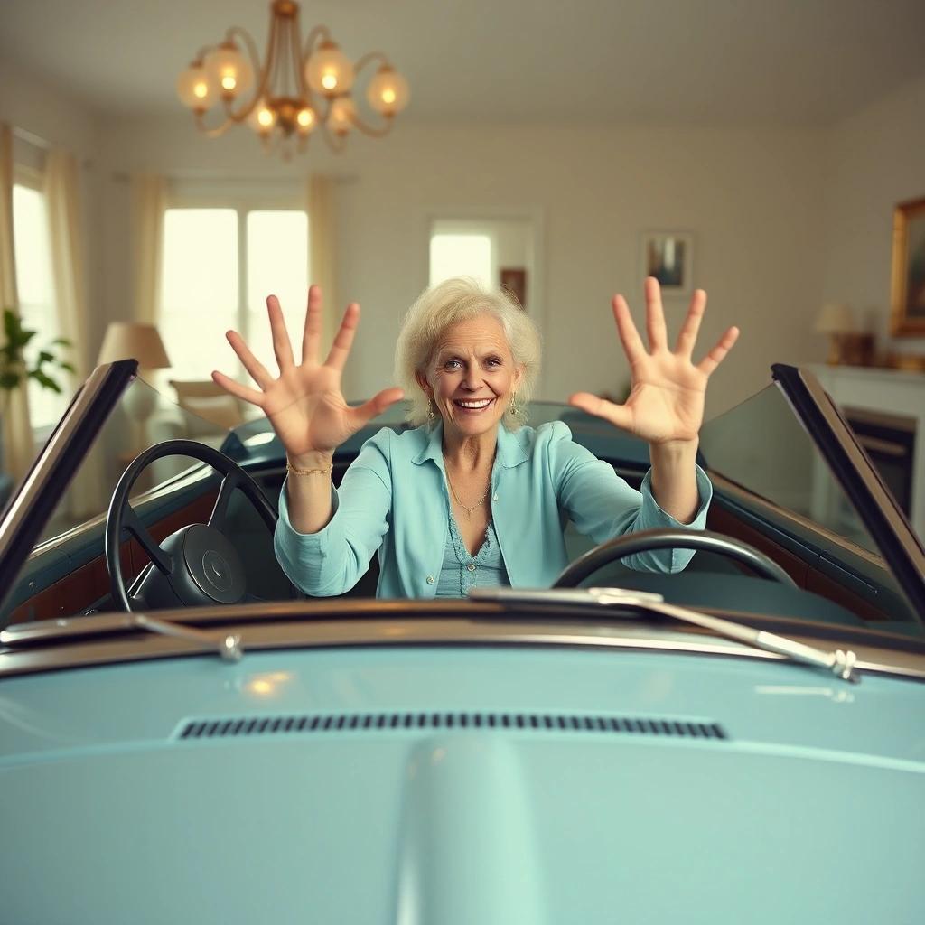 Prompt: a crazy looking mommy with eight fingers on one hand and three fingers on the other. She sits in a baby blue cabriolet which is floating in a livingroom