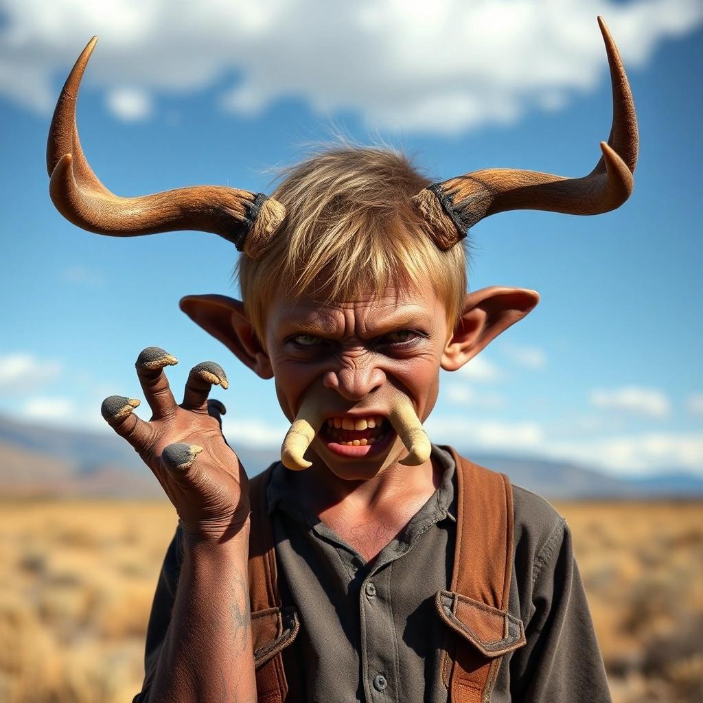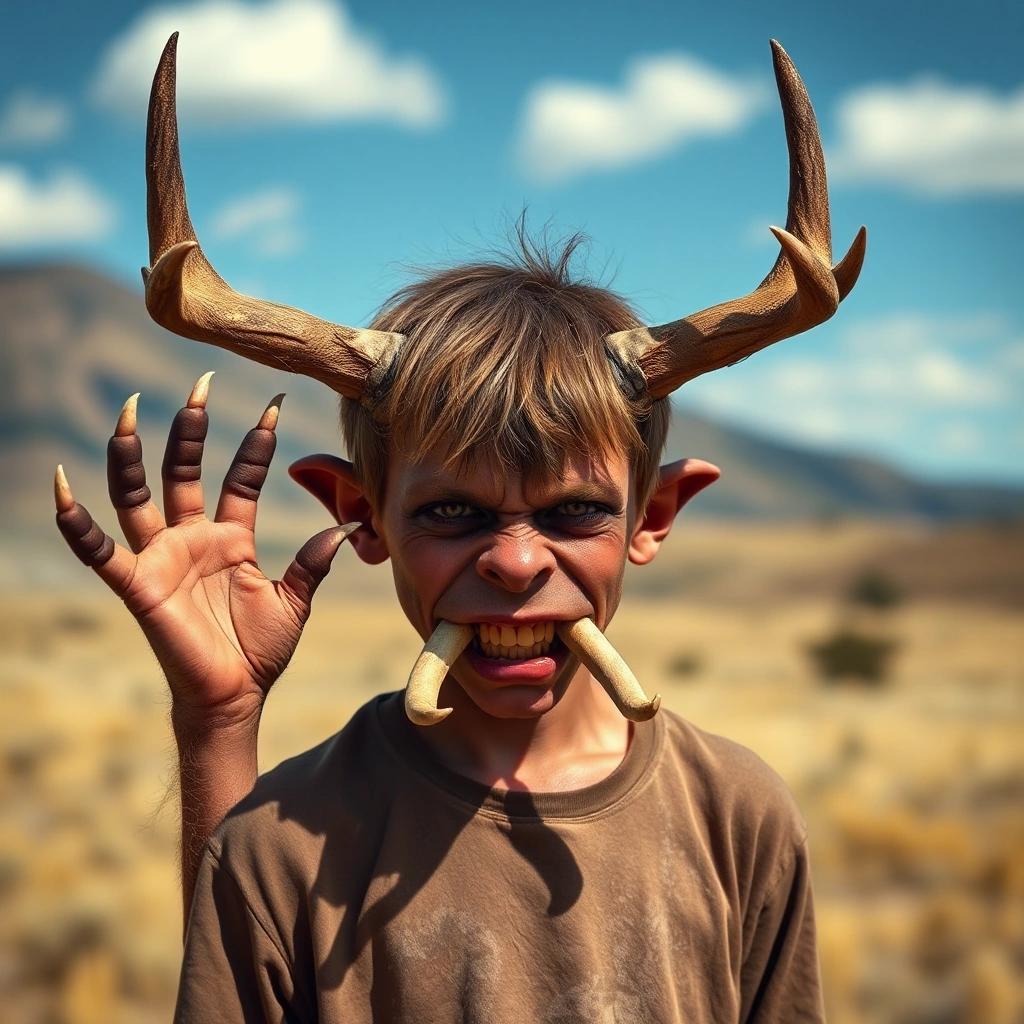 Prompt: an ugly teenage boy with dog paws for hands, deer horns on his head and elephant tusks in his mouth. Let him stand in an open field in colorado