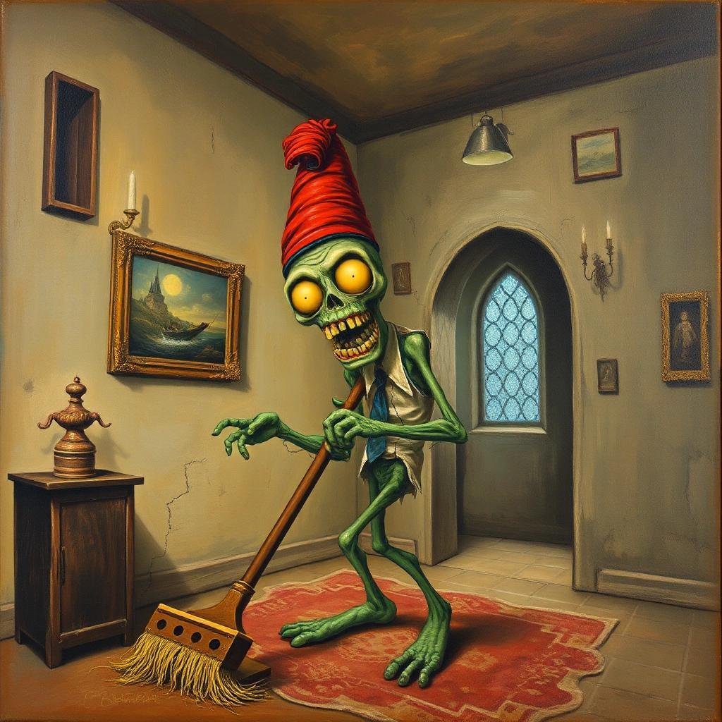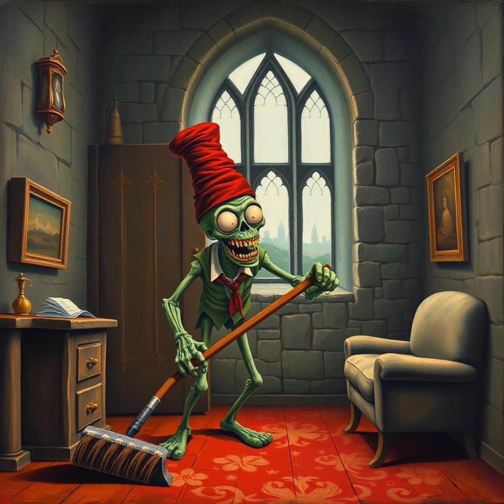 Prompt: a surrealist painting of a happy zombie wearing a fez vaccuming a room in an old castle