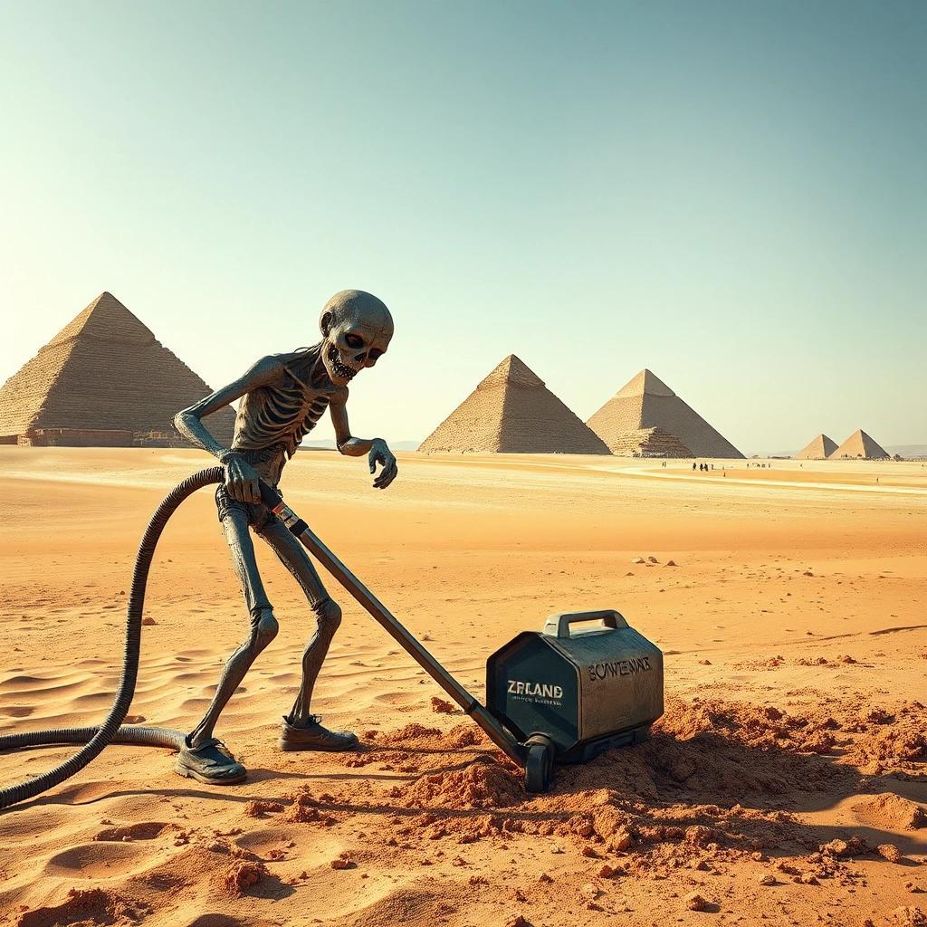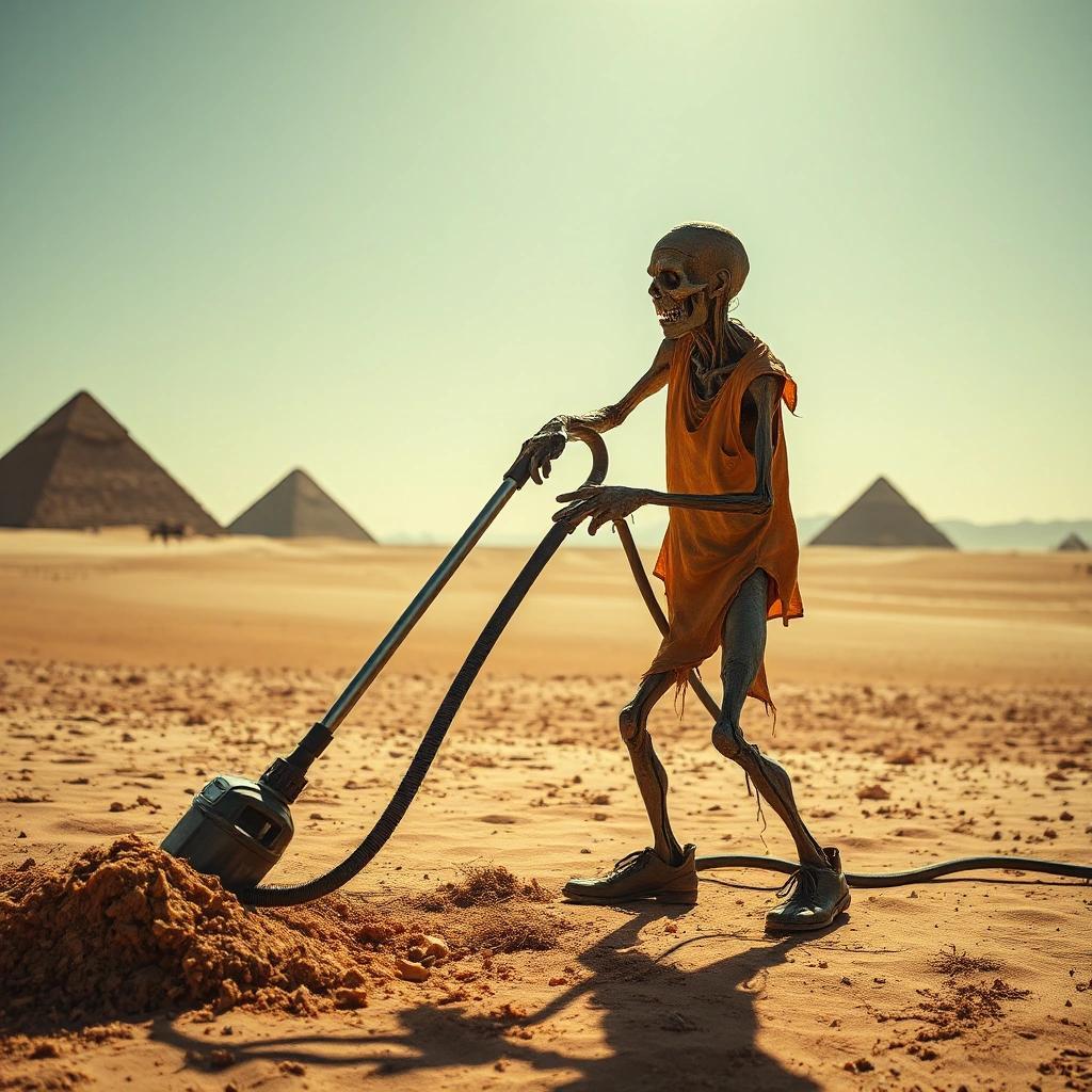 Prompt: a photograph of a human like zombie vacuum cleaning in a desert with some pyramids on a sunny day