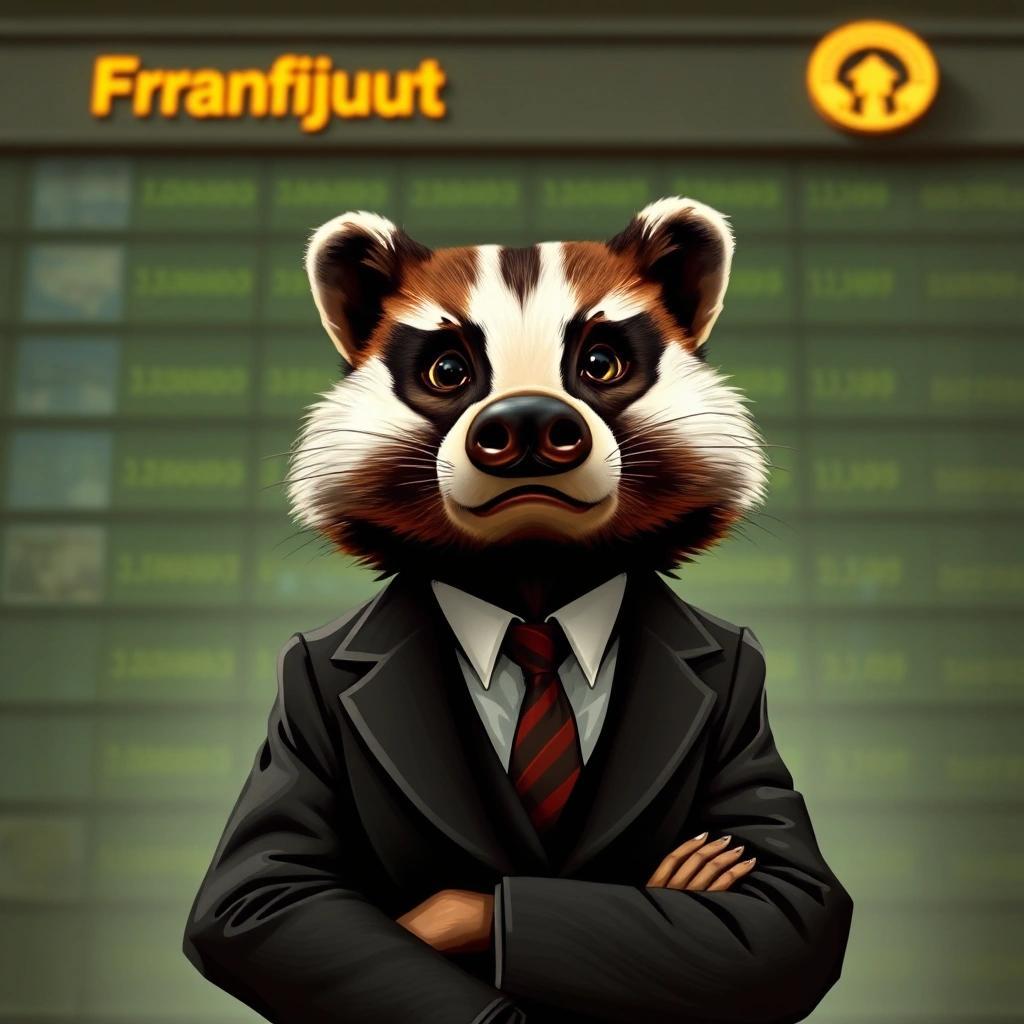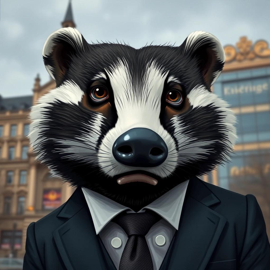 Prompt: A portrait of an anthropomorphic badger wearing a business suit looking very worried and insecure, Frankfurt stock exchange in the background