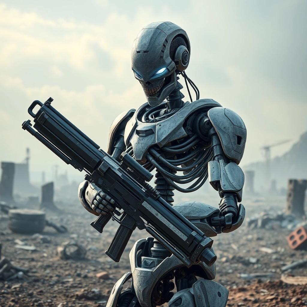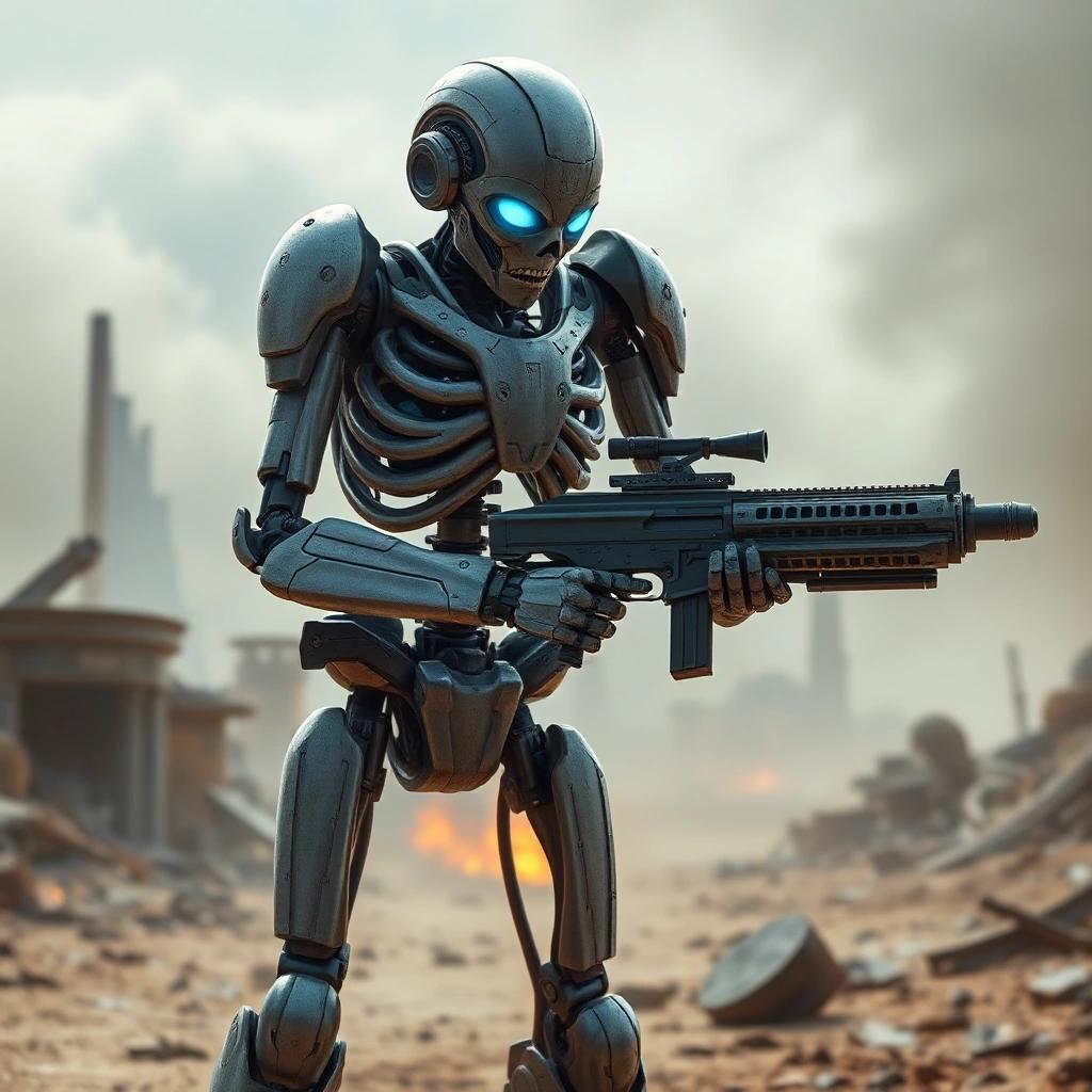 Prompt: a photorealistic image of an armored android robot skeleton with a human head having blue glowing eyes checking a futuristic weapon on a wasteland full of ruins