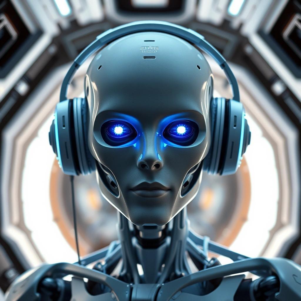 Prompt: a picture of a human with an android skeleton with dark blue glowing eyes and futuristic headphones. The context is a space ship