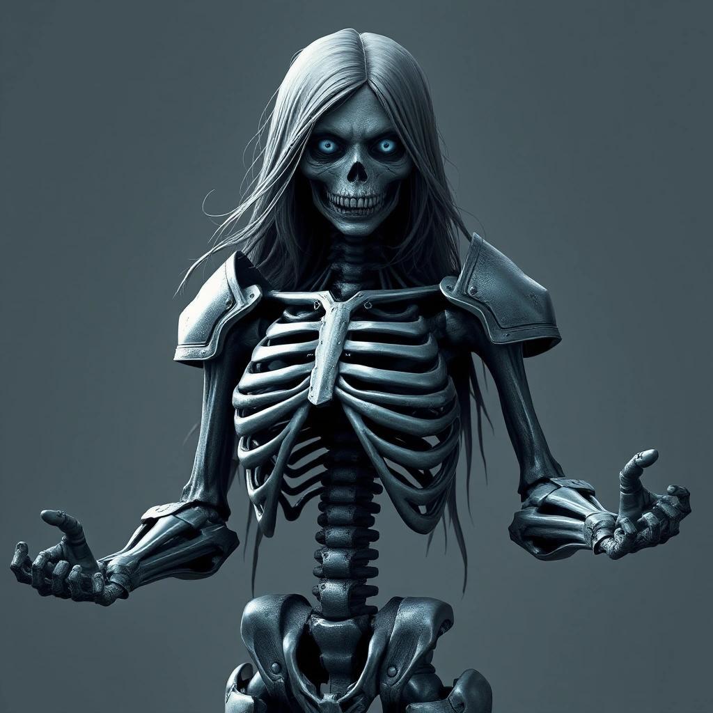 Prompt: a female zombie with an armored skeleton body in steel. She has dark blue eyes and four arms.