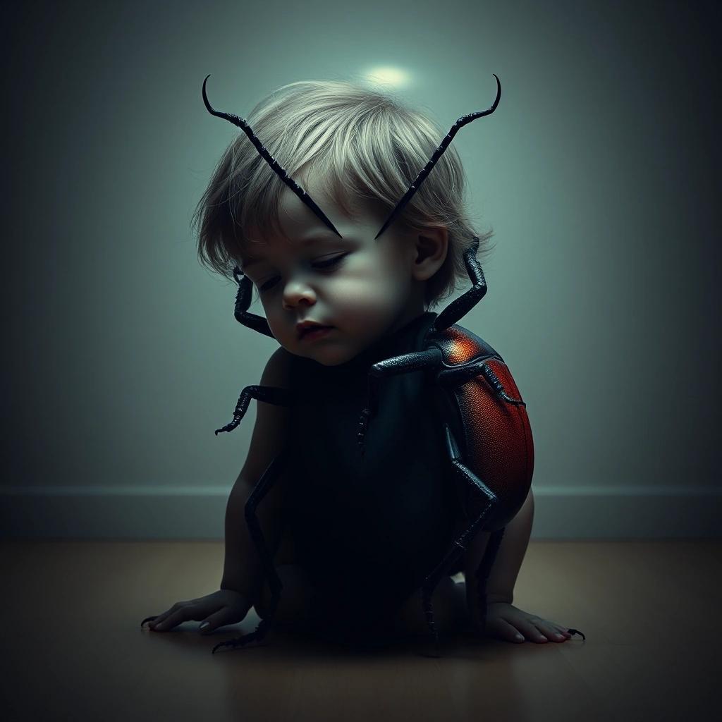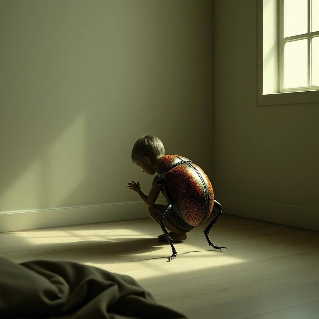Prompt: an image of a child morphing into a beetle in a solitude room