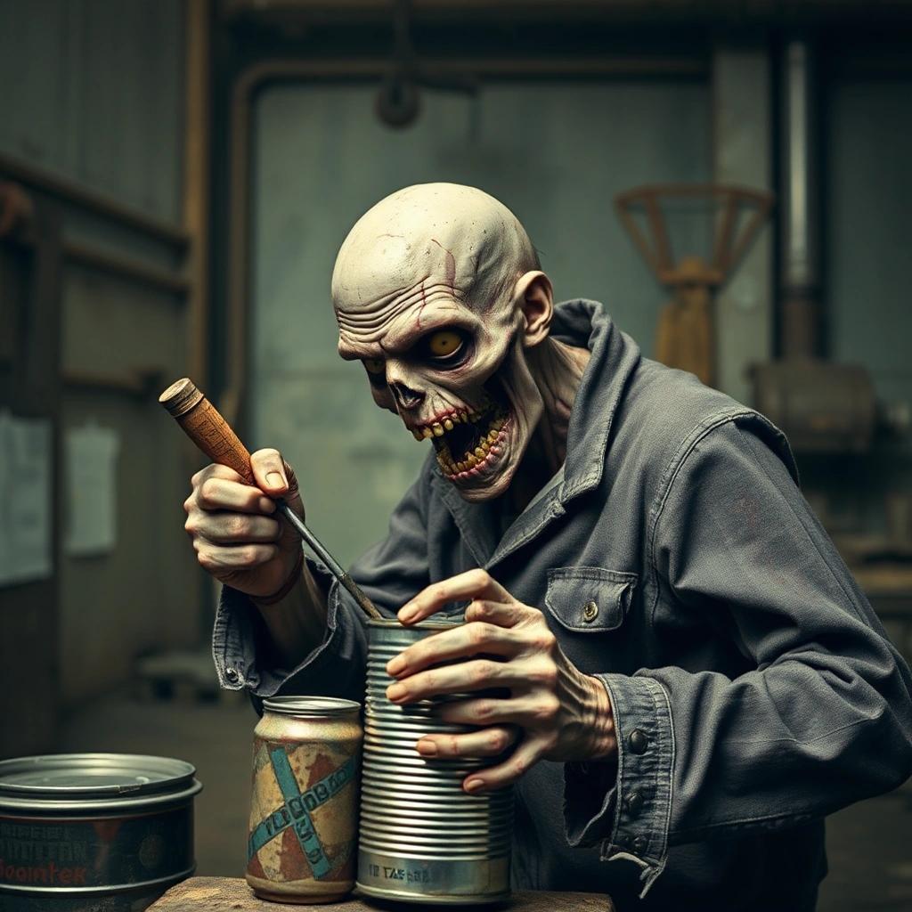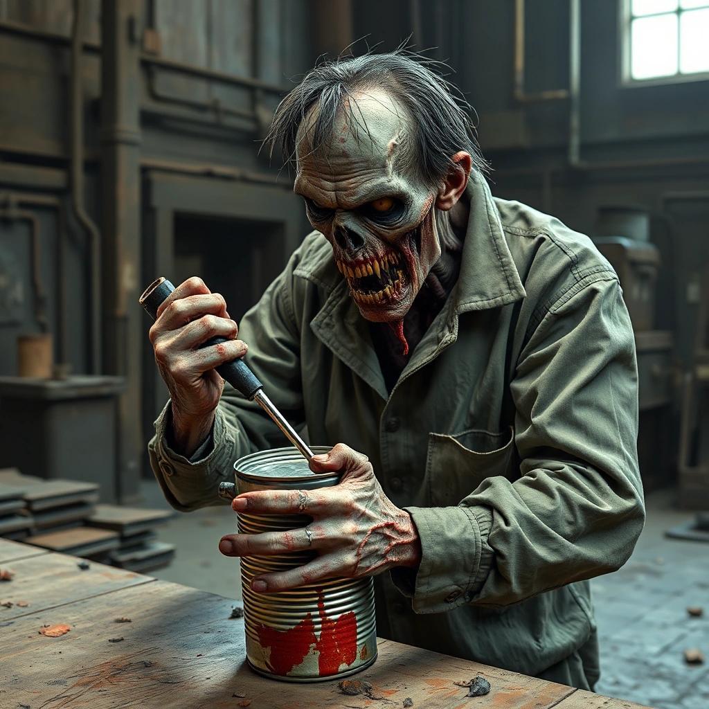 Prompt: an image of a male rotten zombie in a straight jacket trying to pry a tin can open with a screwdriver in an old factory setting