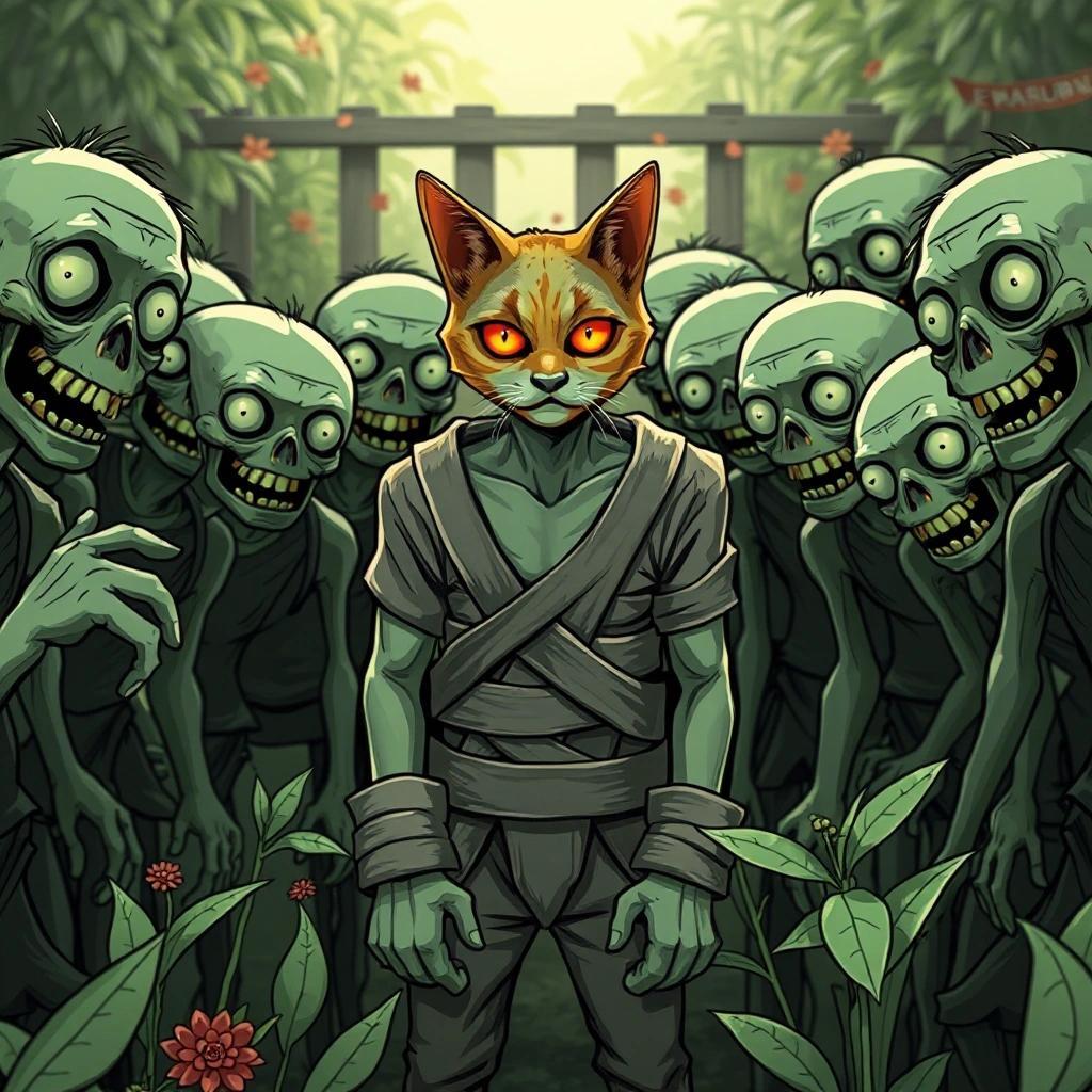 Prompt: a group of happy zombies with a human in a straitjacket in the middle. Let the human have orange cat eyes. Let the context be a garden