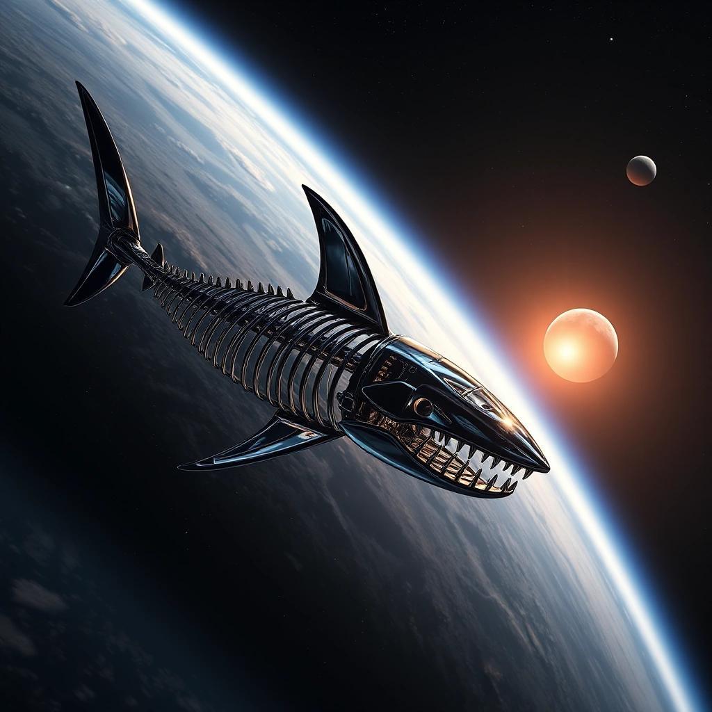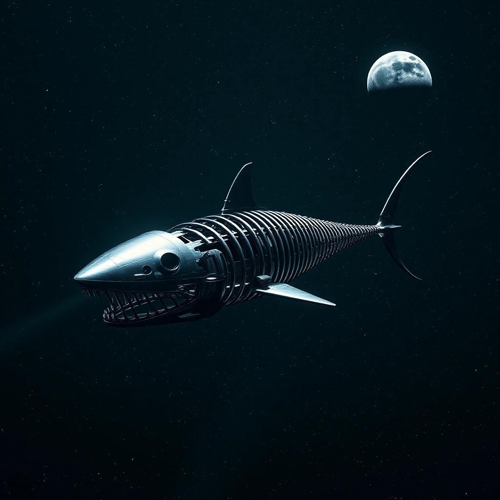 Prompt: a spaceship flying in space in the shape if shark skeleton in metal with a glass coating instead of skin. In the far right corner there is a small planet with two surrounding moons