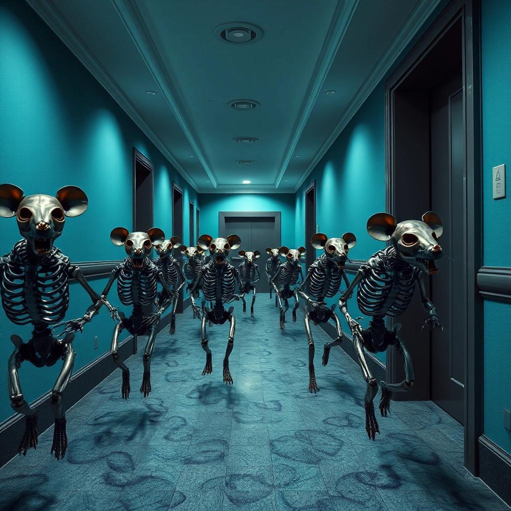 Prompt: photorealistic images of a pack of rat skeletons in shining metal running down a long hotel hallway with an elevator at the end of the corridor. The walls are azure colored and the doors are dark gray