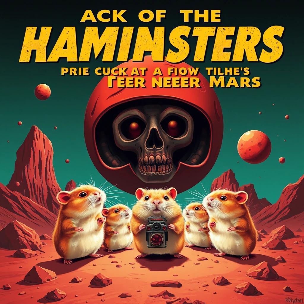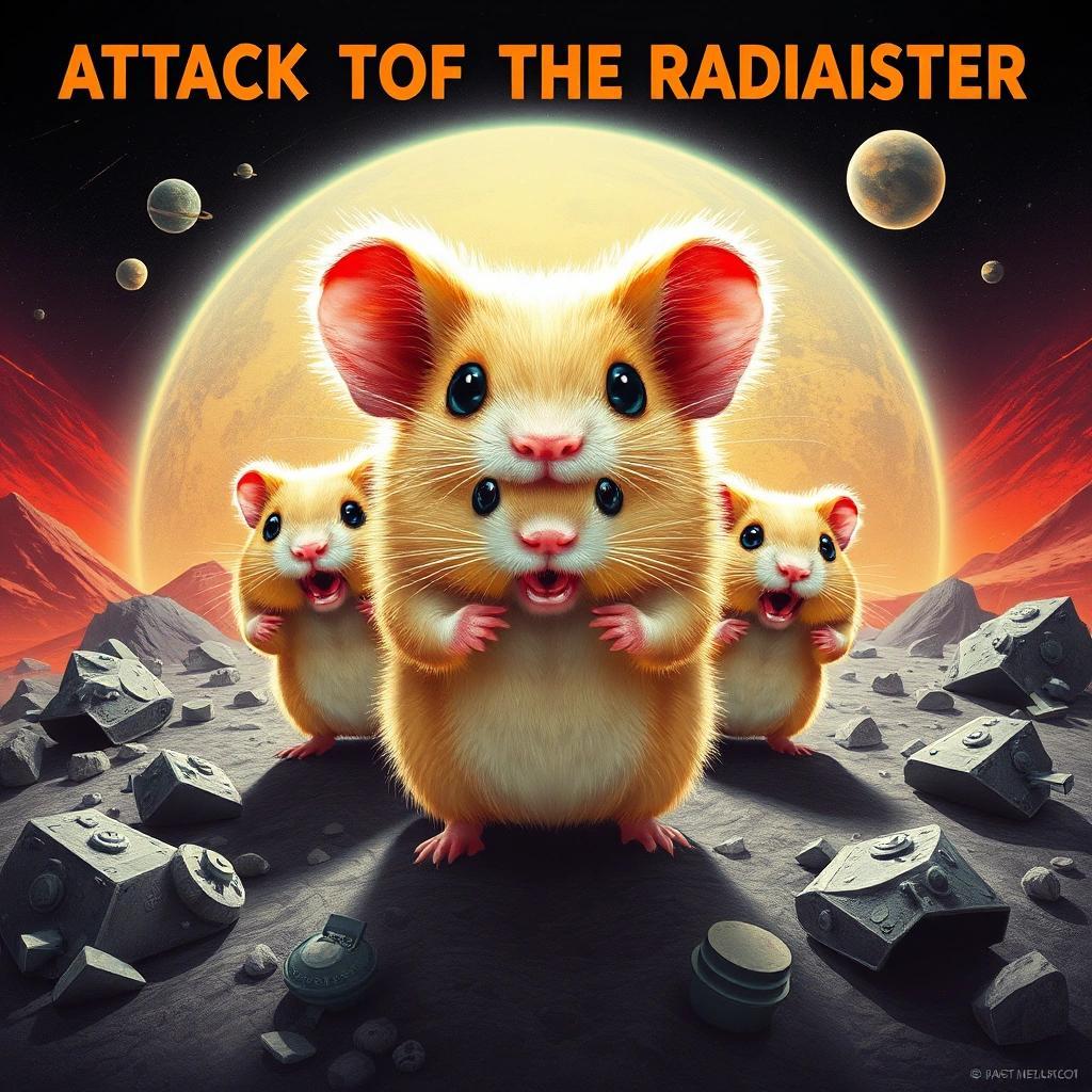 Prompt: Attack of the Radioactive Hamsters from a Planet Near Mars, film poster, movie poster, science fiction, comedy, cute, funny (masterpiece), best quality