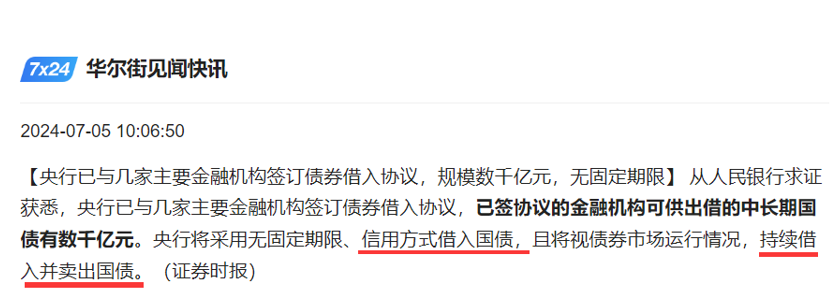 【央行已与几家主要金融机构签订债券借入协议,规模数千亿元,无固定期限】 从人民银行求证获悉,央行已与几家主要金融机构签订债券借入协议,已签协议的金融机构可供出借的中长期国债有数千亿元。央行将采用无固定期限、信用方式借入国债,且将视债券市场运行情况,持续借入并卖出国债。(证券时报)