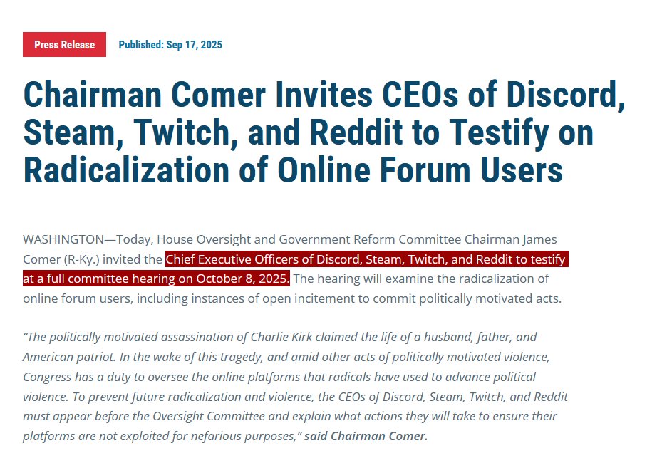 Congress has called the CEOs of Discord, Steam, Twitch, and Reddit to testify on political radicalization following the assassination of Charlie Kirk.