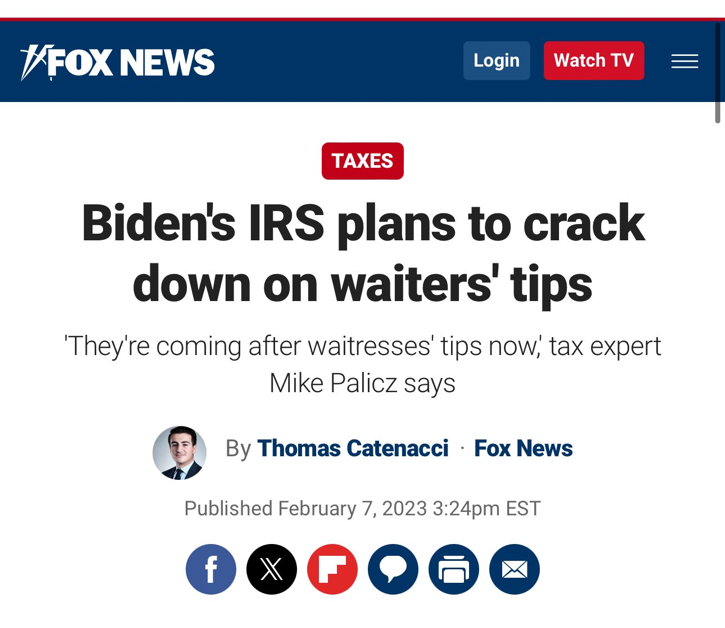 Kamala and Biden have been using the IRS to crack down on and audit waiters over their tips. Has their ever been a more two-faced fraud of a politician than Kamala Harris? She will NEVER fight to reduce the power of the IRS and lower your taxes. Trump will end taxes on tips!!! https://t.co/4RCTquIa00