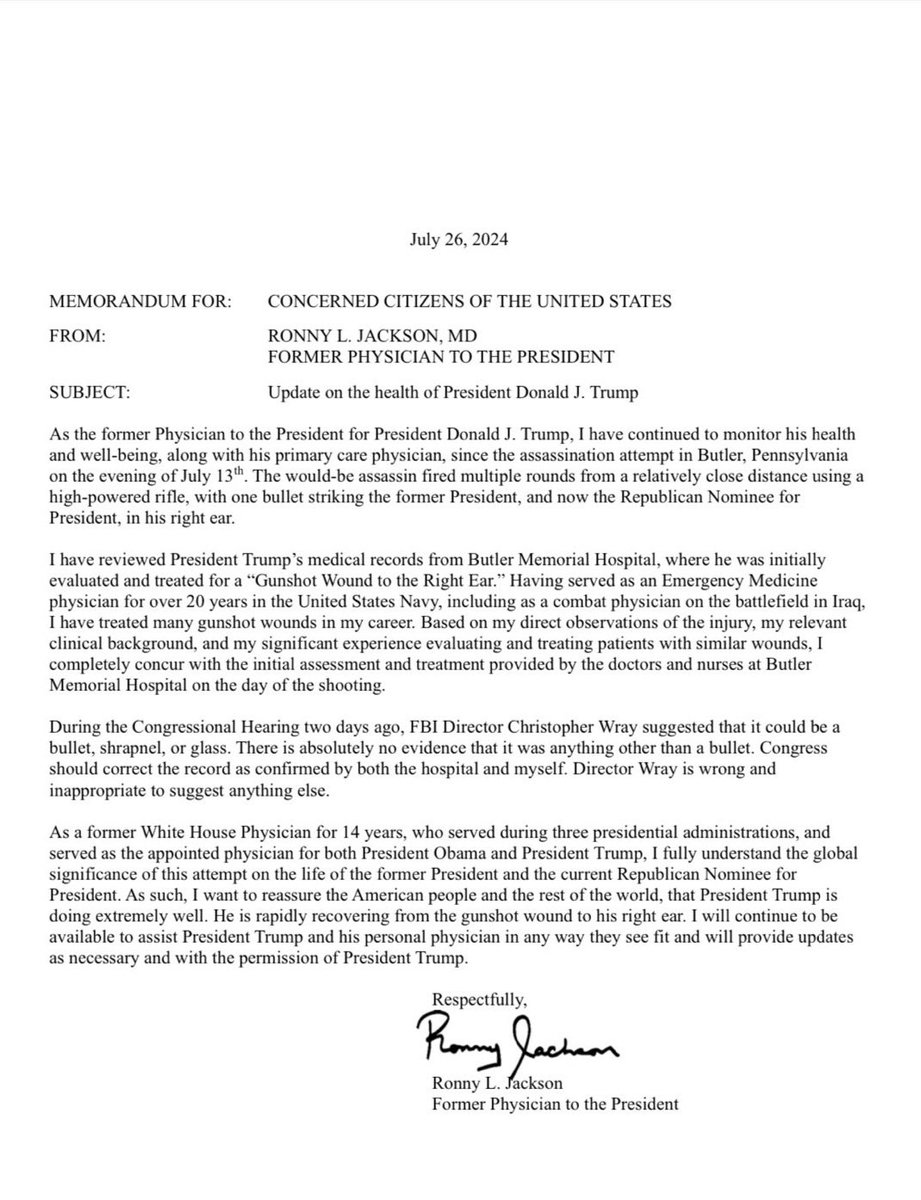 Highly respected former White House Physician Dr. @RonnyJacksonTX: “During the Congressional Hearing two days ago, FBI Director Christopher Wray suggested that it could be a bullet, shrapnel, or glass. There is absolutely no evidence that it was anything other than a bullet… Director Wray is wrong and inappropriate to suggest anything else.”