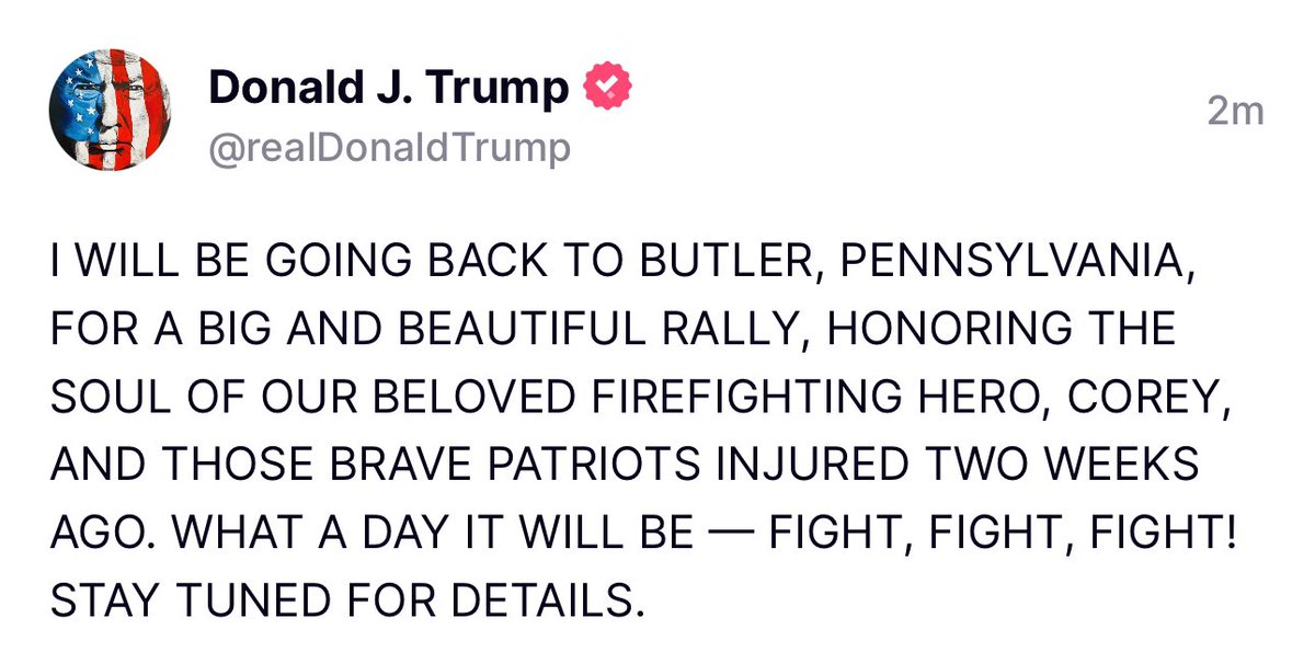 President Trump will be returning to Butler, Pennsylvania. Details coming soon! https://t.co/9dHvIf4p7O