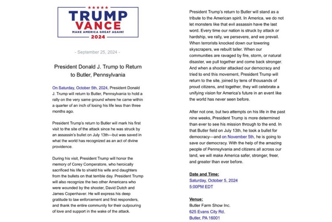 On October 5th, President Trump will be returning to Butler, Pennsylvania. 🇺🇸