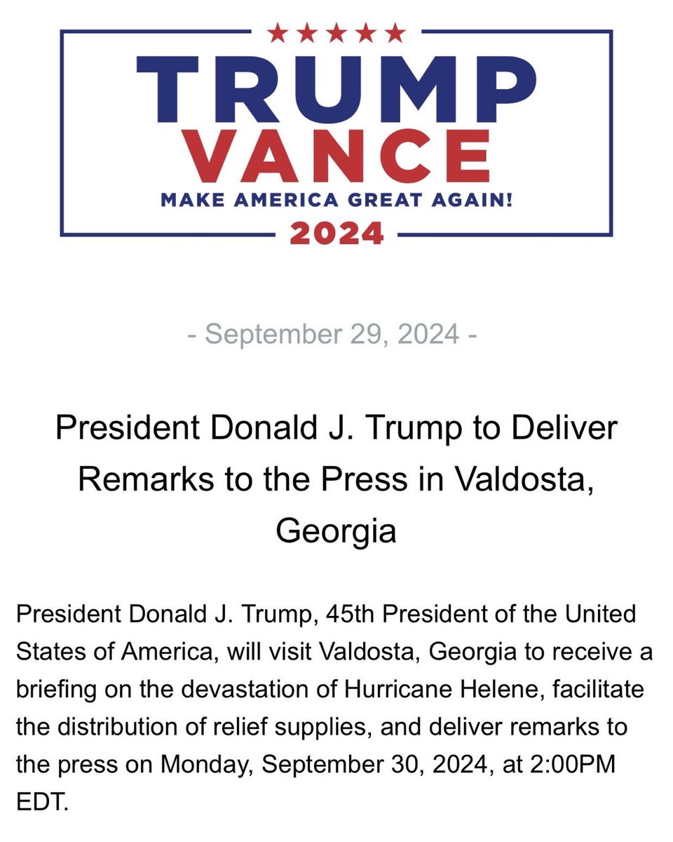 🚨Tomorrow, President Donald J. Trump will visit Valdosta, Georgia, to receive a briefing on the devastation of Hurricane Helene, facilitate the distribution of relief supplies, and deliver remarks to the press.